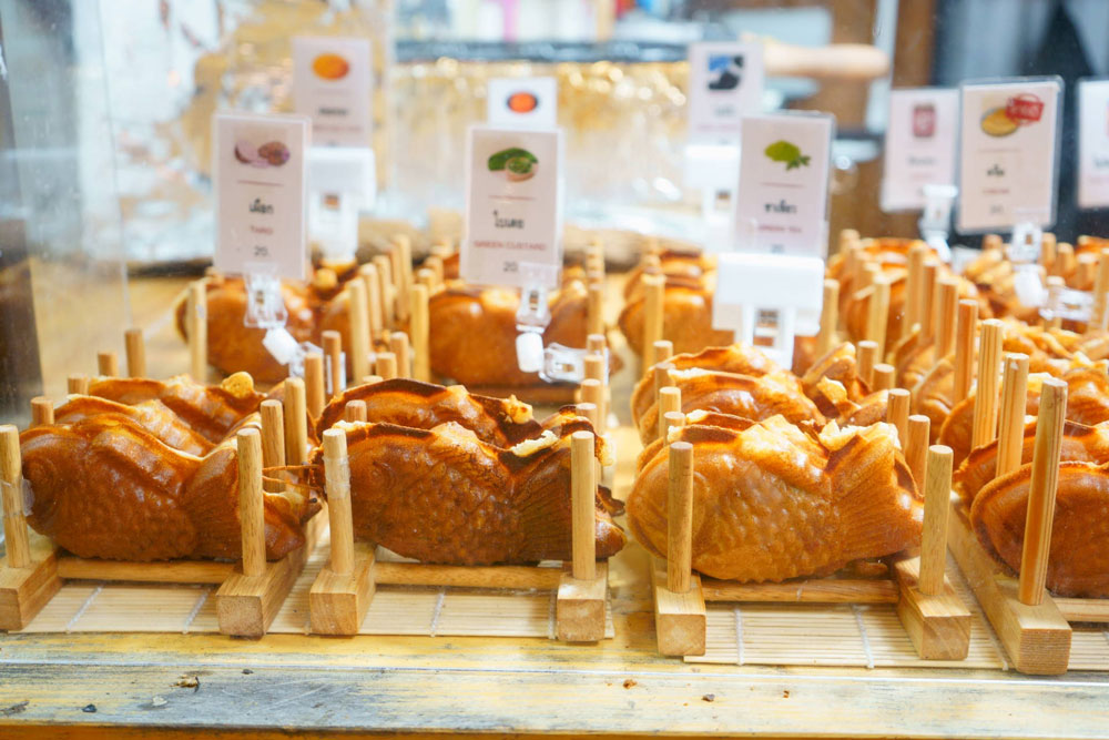 タイ焼きを発見!見た目は日本のものとよく似ていますが、ココナッツやパンダン、タロイモなど、個性豊かなフレーバーが揃っています。異国の地でタイ焼きにトライしてみるのもおもしろそうです。