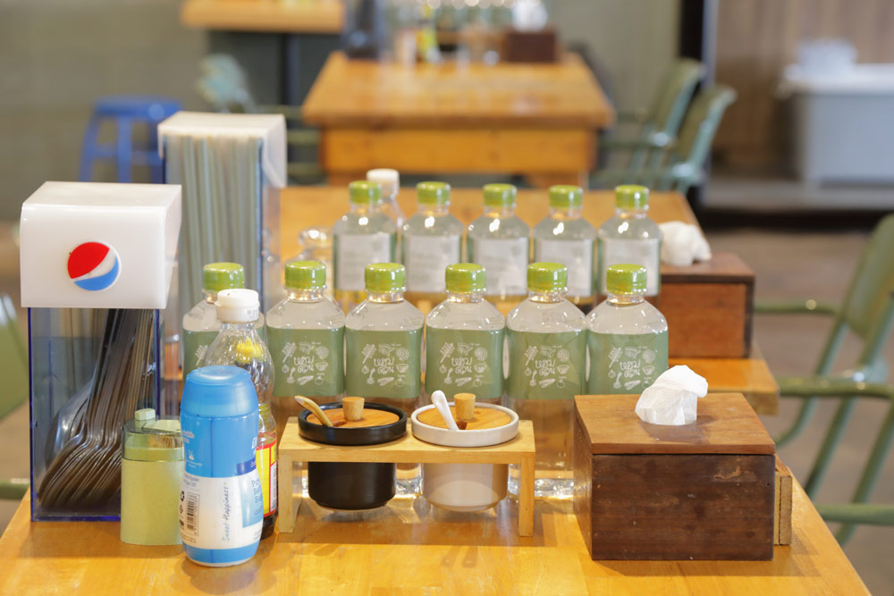 飲み物はセルフサービス。氷とグラスは店内にまとめて置いてあり、水はペットボトル(有料)がテーブルに並んでいます。こちらのペットボトルはお店のオリジナルなんですよ。