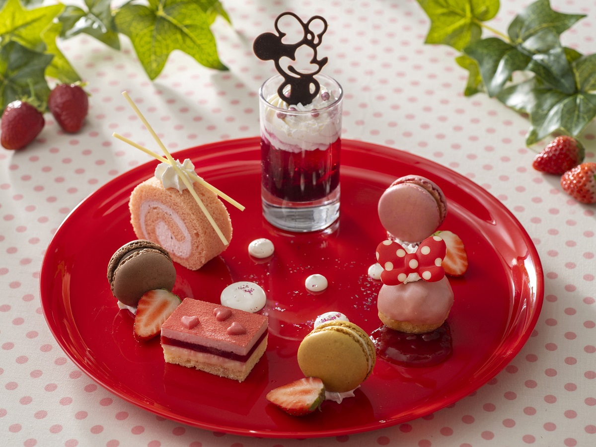 ミニーマウスのシルエットのチョコレートが乗った、ミックスベリーとハイビスカスフレーバーゼリーのグラスデザートや、ドット柄のリボンがモチーフのチョコが乗ったイチゴのプチシュークリームなどを盛り合わせたキュートさがあふれるプレートです。
