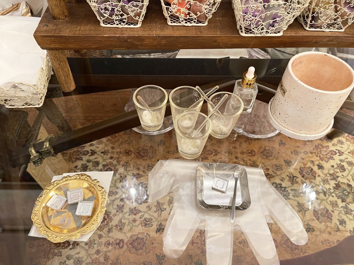 体験時間は60分のうち、30~45分はアイシャドウ作りの作業時間。残りの時間は、お店の撮影ブースで写真撮影タイムです。十分な作業時間が設けられていますが、たくさん顔料があって迷ってしまうので、事前に作りたい色味を決めておくとスムーズかも♪