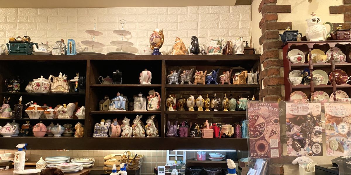 お店に入ると目を引くのが、壁一面にずらりと並んだティーポットの数々。動物やバック、地球儀などほかではあまり目にしたことがない珍しい形のものが並んでいます。その種類は300を超えるというから驚きです。
