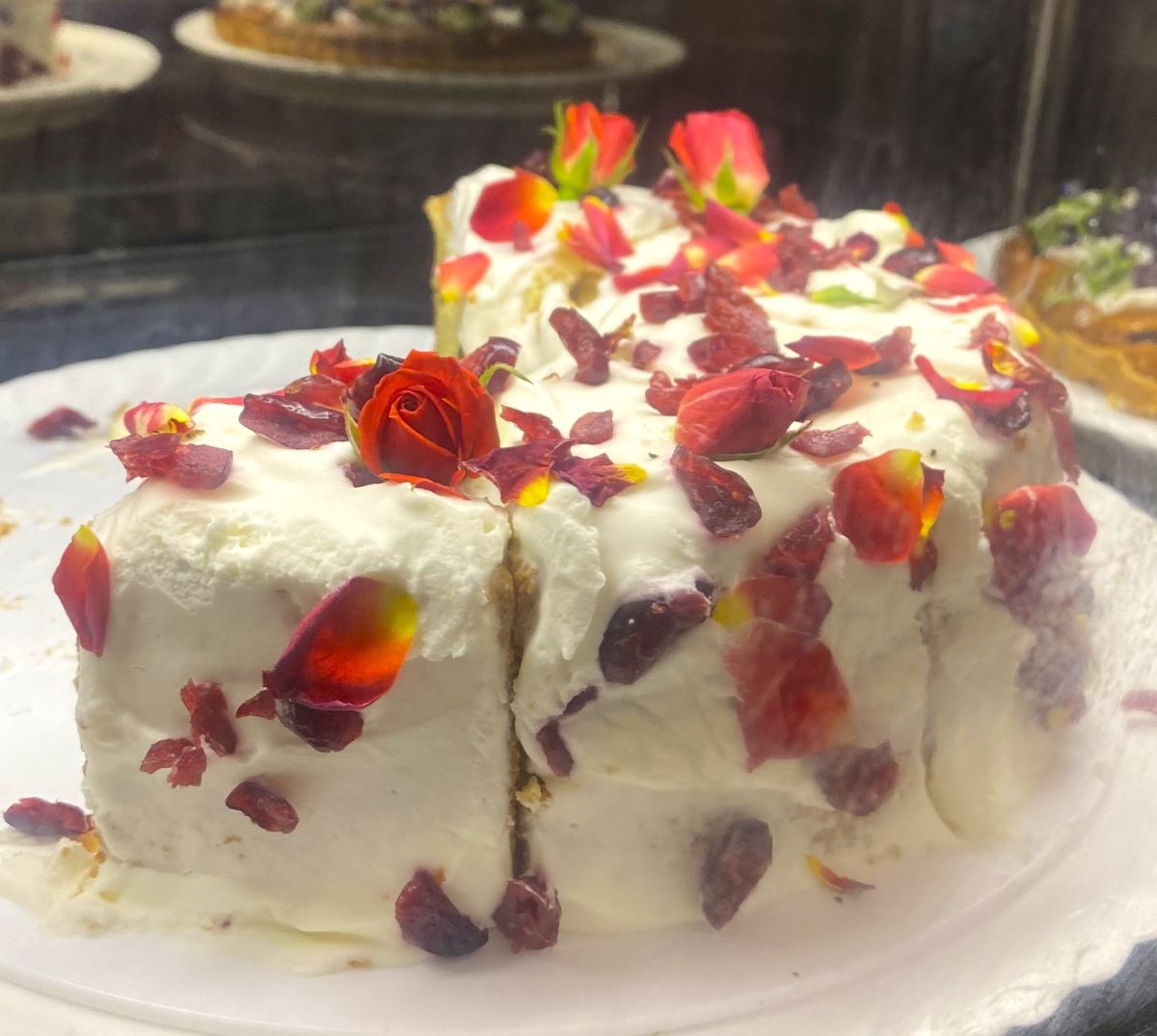 こちらは「カフェ シャンソニエ アコリット」の定番人気である「バラのシフォンケーキ」単品販売600円、ドリンク付きのケーキセット1380円。食べられるバラの花びらを使った、華やかさ満点のケーキです。