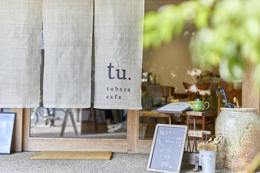 大通りの堀川通と今出川通の北西交差点にある鶴屋𠮷信本店の隣にあり、堀川通に面した側の入り口から入るのが「tubara cafe」。控えめな「tu.」のロゴが目印です。