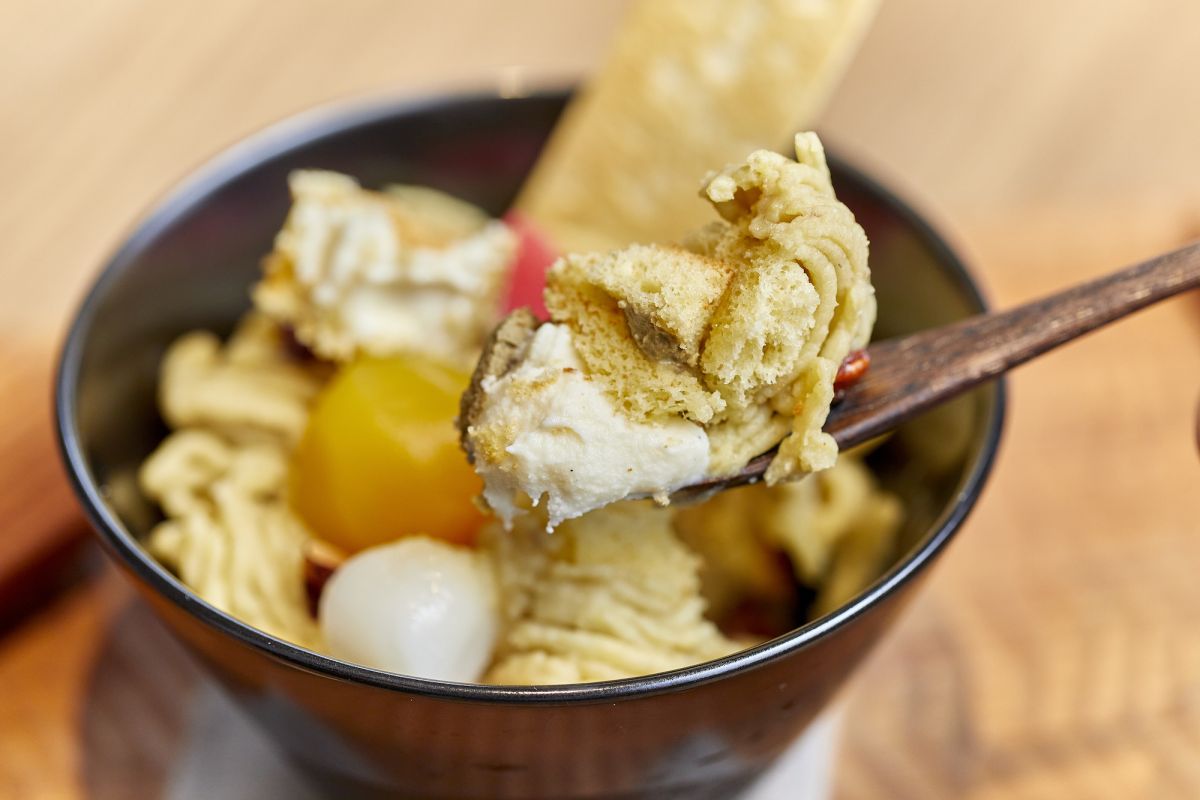 中に入っているのは、シフォンケーキと2種類のアイス。このシフォンケーキの素材にも白あんが使われていて、見事な和洋折衷。ほんのりと焦げた砂糖の苦味とカリッとした食感が香ばしいアーモンドプラリネとシフォンのやわらかさのコントラストもよく、さまざまなスイーツの美味しさをこの1杯で堪能できます。