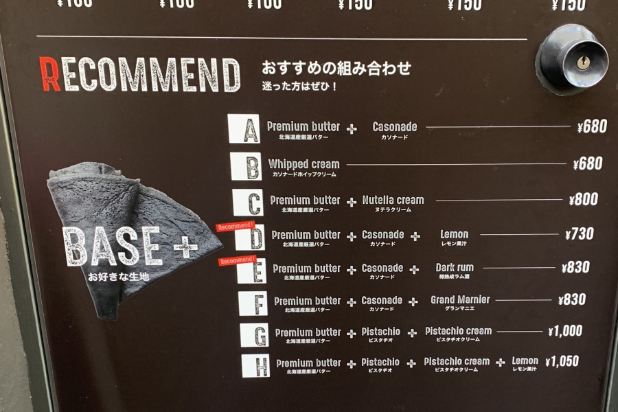 お店の前のメニューには、生地とトッピングの種類がズラッと並びます。生地は5種類、トッピングは12種類用意されています。お好きな生地を1種類選び、トッピングを追加していきます。