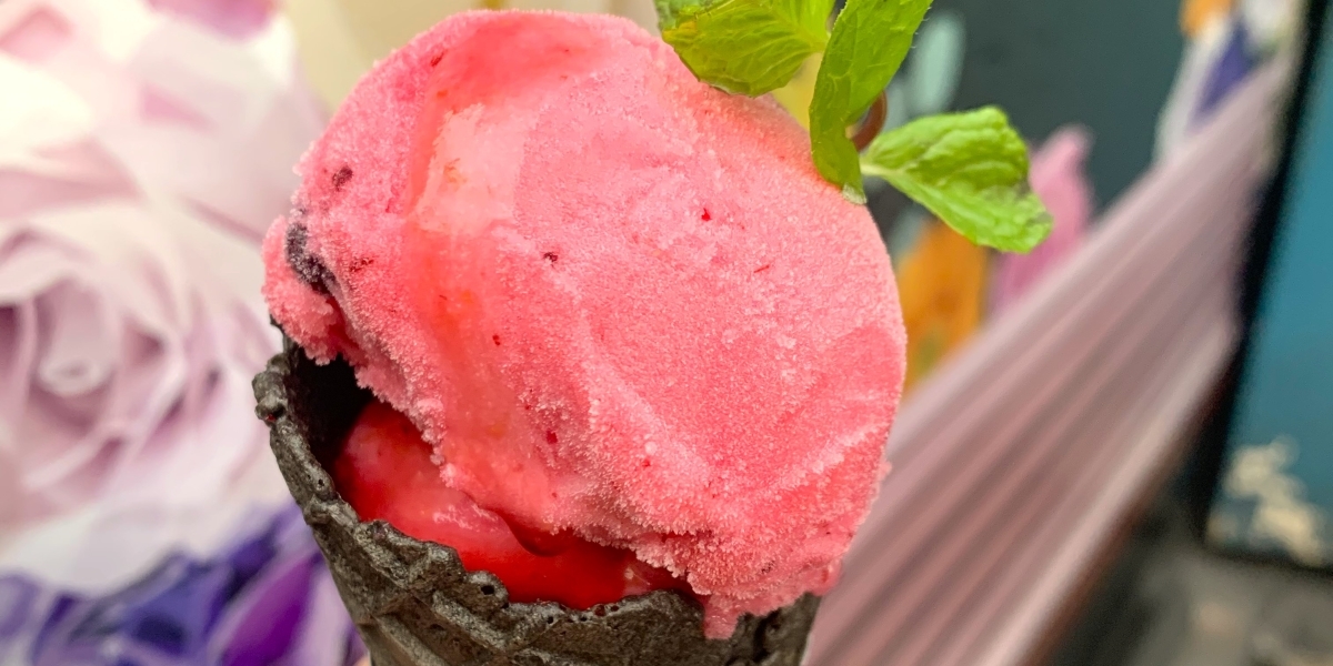 もう1つ、「トリプルベリーアイス」500円をいただきました。こちらもテーマカラーである「黒」のコーンに盛り付けられているので、アイスの鮮やかさが引き立ちます。お店の正面右側にあるフォトジェニックなフォトスポットの前で写真を撮れば、SNS映え間違いなしです。