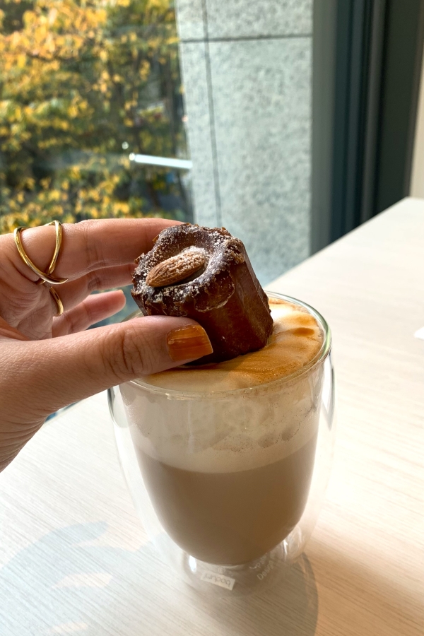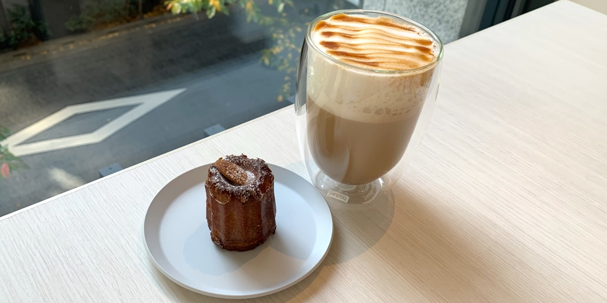 お店推奨の食べ方は、コーヒーの上のフォームミルクにカヌレをディップする方法とのこと。ふわふわのフォームミルクにカヌレをディップすると、ヘーゼルナッツの香りにマッチ!味変しながら、最後まで飽きずにいただくことができます。