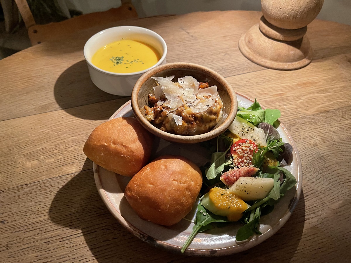 取材時にいただいたのは、洋食メニューの「茄子のラザニア」1500円。天然酵母パンや季節のフルーツを添えたフレッシュなサラダ、ニンジンのポタージュが添えられ、ボリューム満点。もちろん、サラダのドレッシングも自家製です。