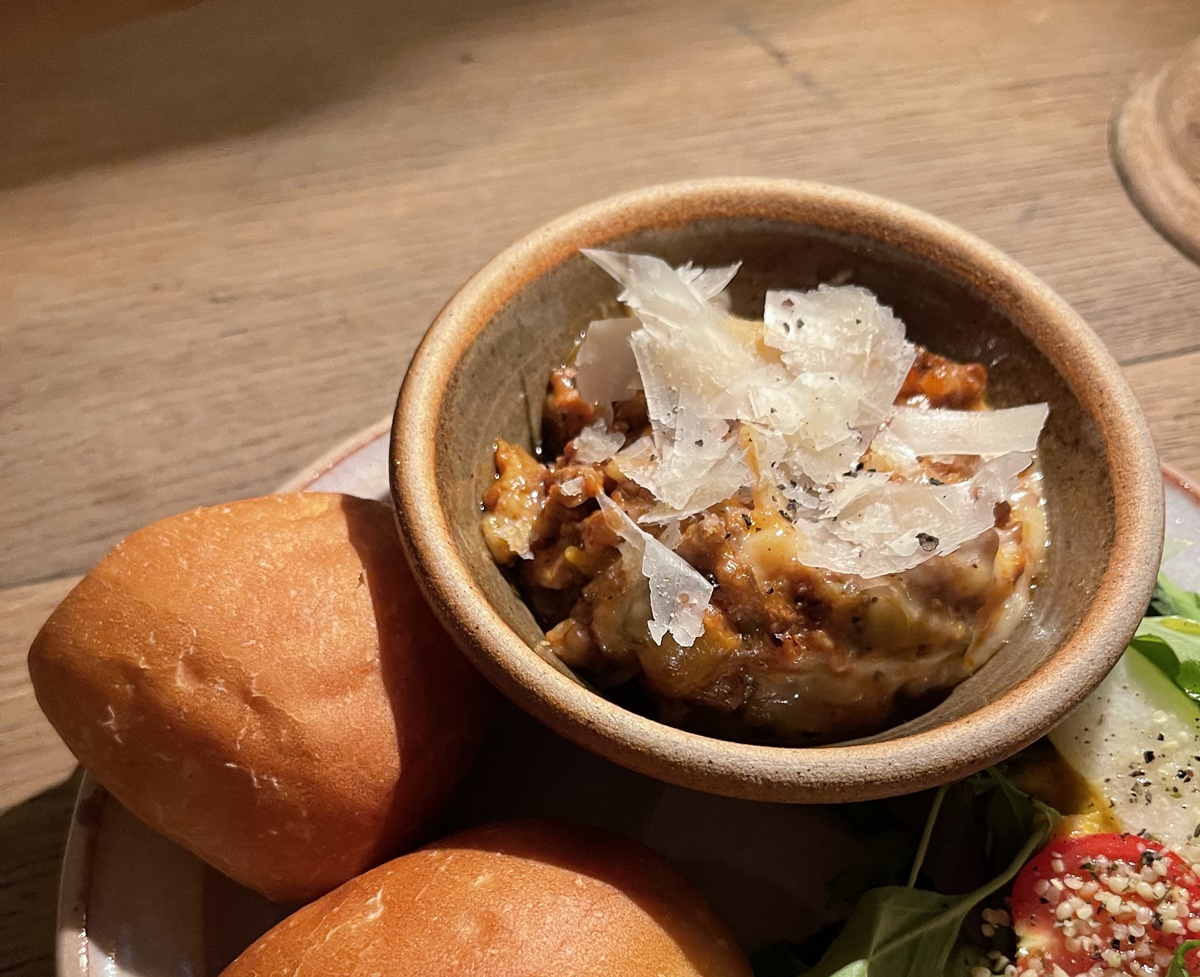 ラザニアのソースにたっぷり入った粗びき肉がジューシーです。ぜひ焼きたてアツアツを召し上がれ!