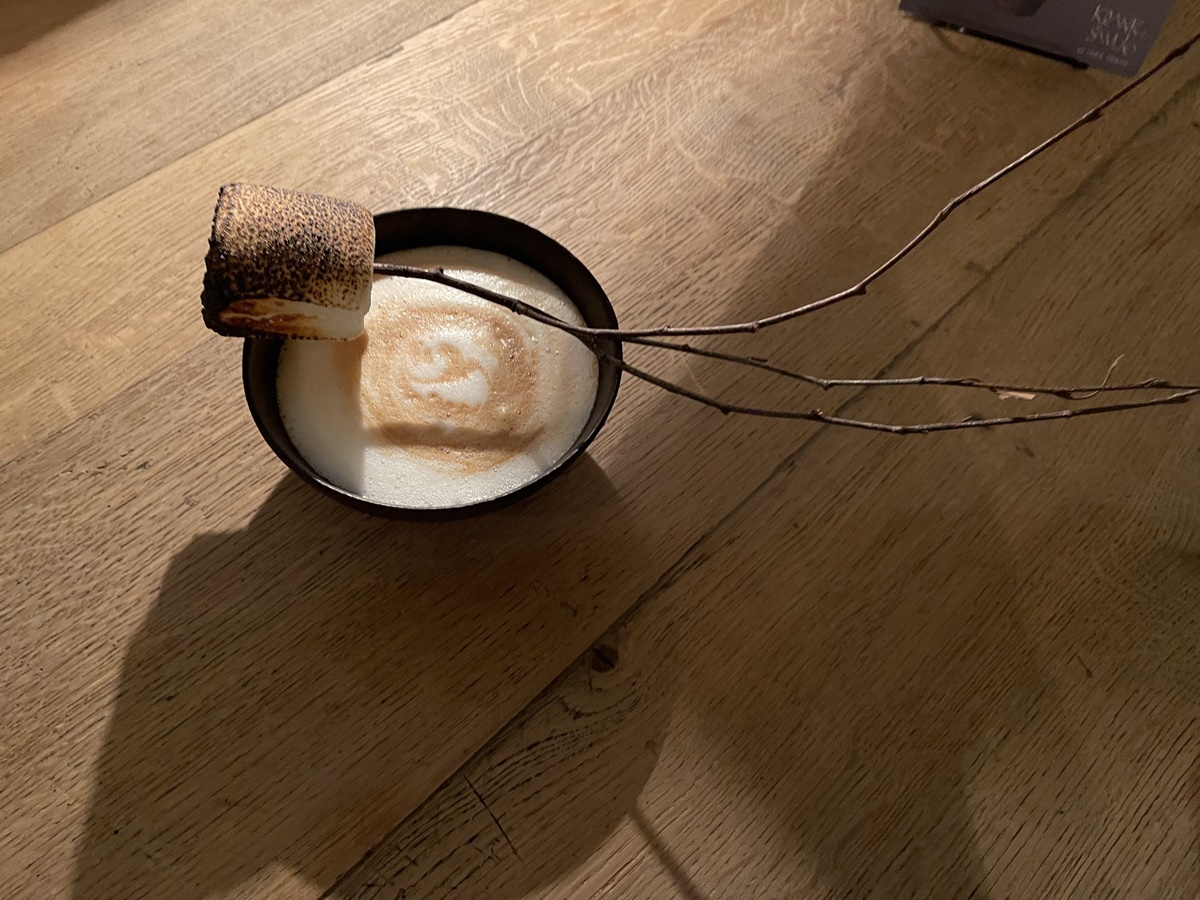 こちらは名物の「焚火ラテ」850円。和の器に注がれたカフェラテに添えられているのは、木の枝に刺して炙った大きなマシュマロ!温かいマシュマロをラテに浸しながら食べるのがおすすめです。