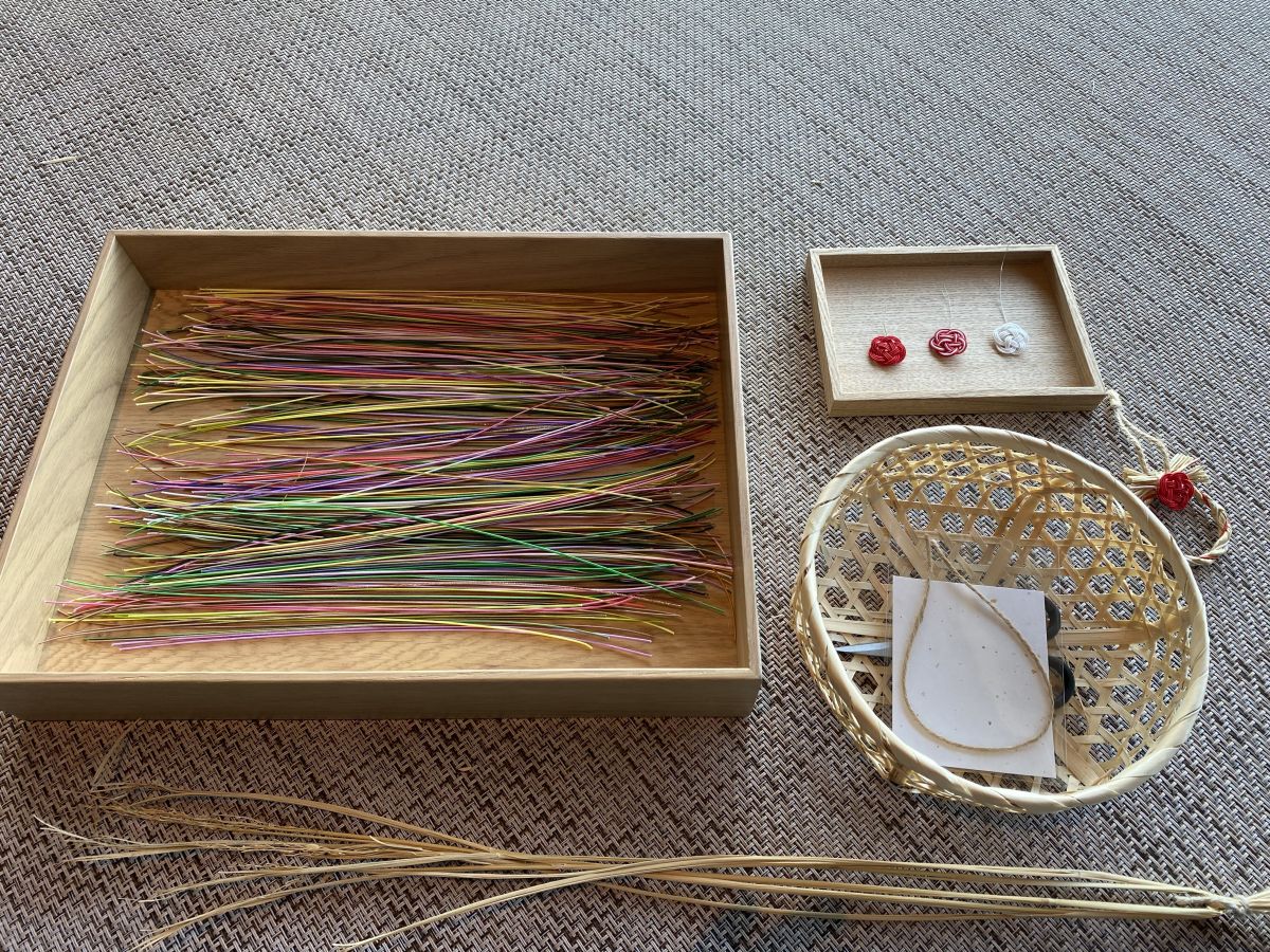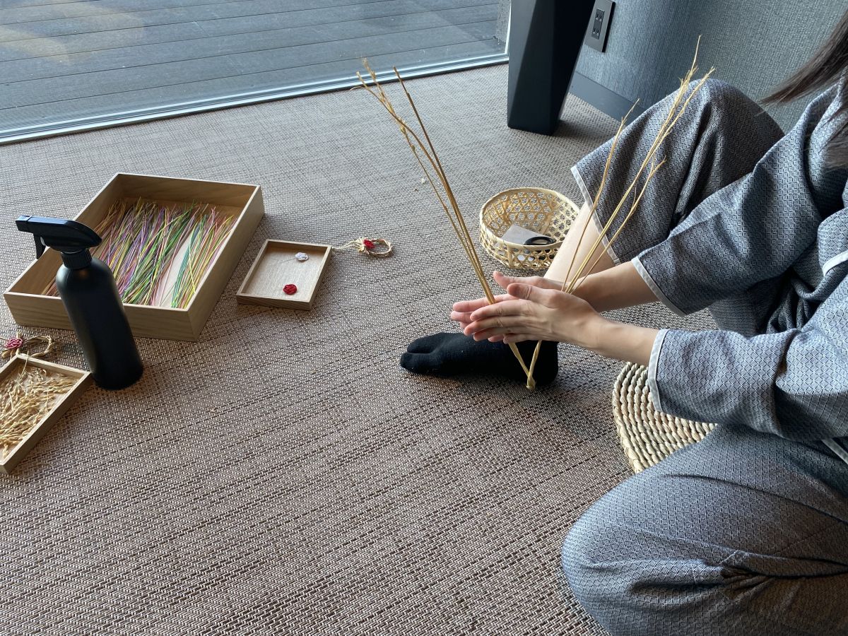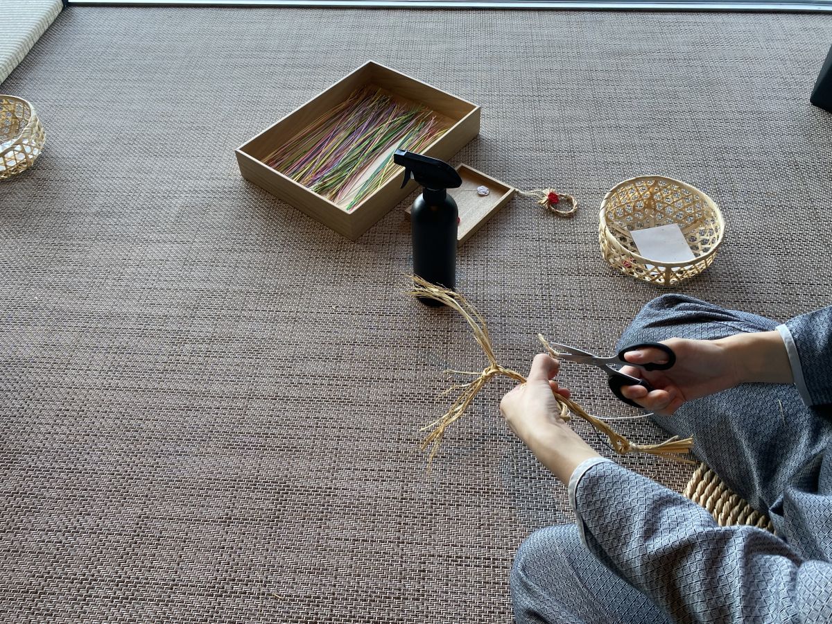 朝食後は、全国の「界」で開催されている体験メニュー「ご当地楽」に挑戦!「界 由布院」では「わら綯い(ない)体験」をすることができます。スタッフの説明を受けたら、まずは好きな色の紐と水引きを選びます。