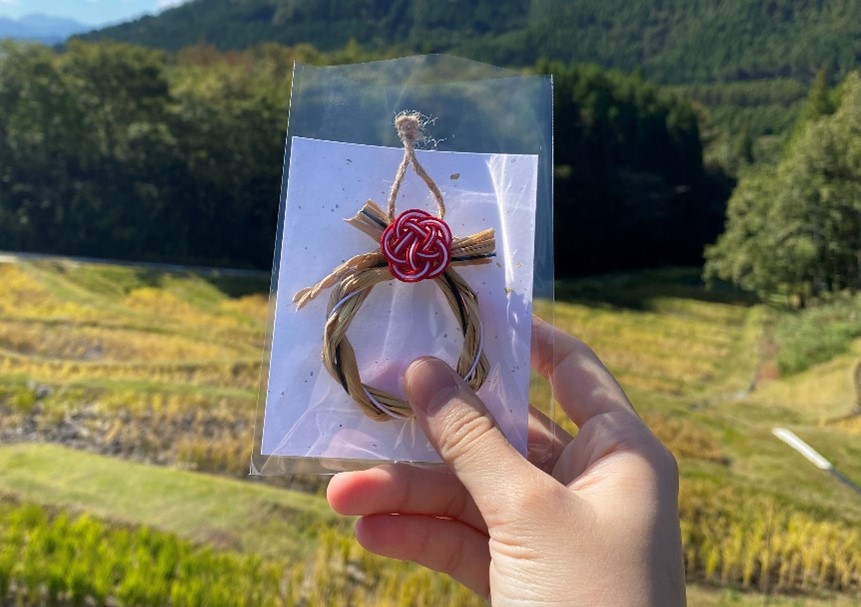 藁が合わさったら、お守りの形に整えていきます。最後に水引きと稲穂を付けたら、完成!藁でできたお守りは、棚田が特徴的の「界 由布院」らしい思い出になりますね。ぜひ挑戦してみてください。