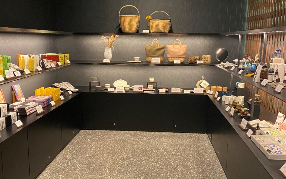 帰る前に、フロント横のおみやげショップをチェック!竹のカゴや、「蛍かご照明」で使われていた七島藺のキーホルダーなど、大分の工芸品を販売しています。また、部屋の中にあったかわいらしいマグカップや、手触りがよい竹のコップも売られているので、気に入ったものは購入して自宅でも使うことができます♪