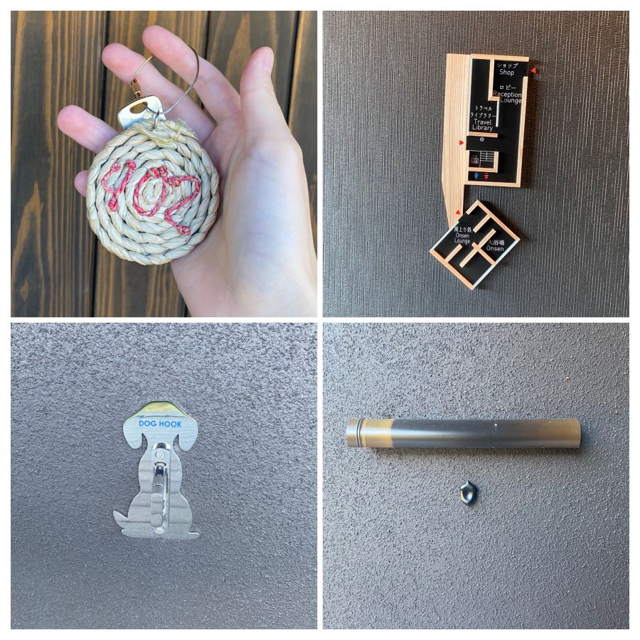 こだわりは部屋だけではなく、館内の至るところに。私が見つけたもの4つをご紹介します。①七島藺でできた部屋のキー、②竹でできた立体的な館内図、③ペット連れの方用の犬の形をしたドックホック、④階数をどんぐりの数で表したモチーフなどなど…細かいところまでかわいい!特にドックホックは場所によってデザインが違うので、ぜひ探してみてください。