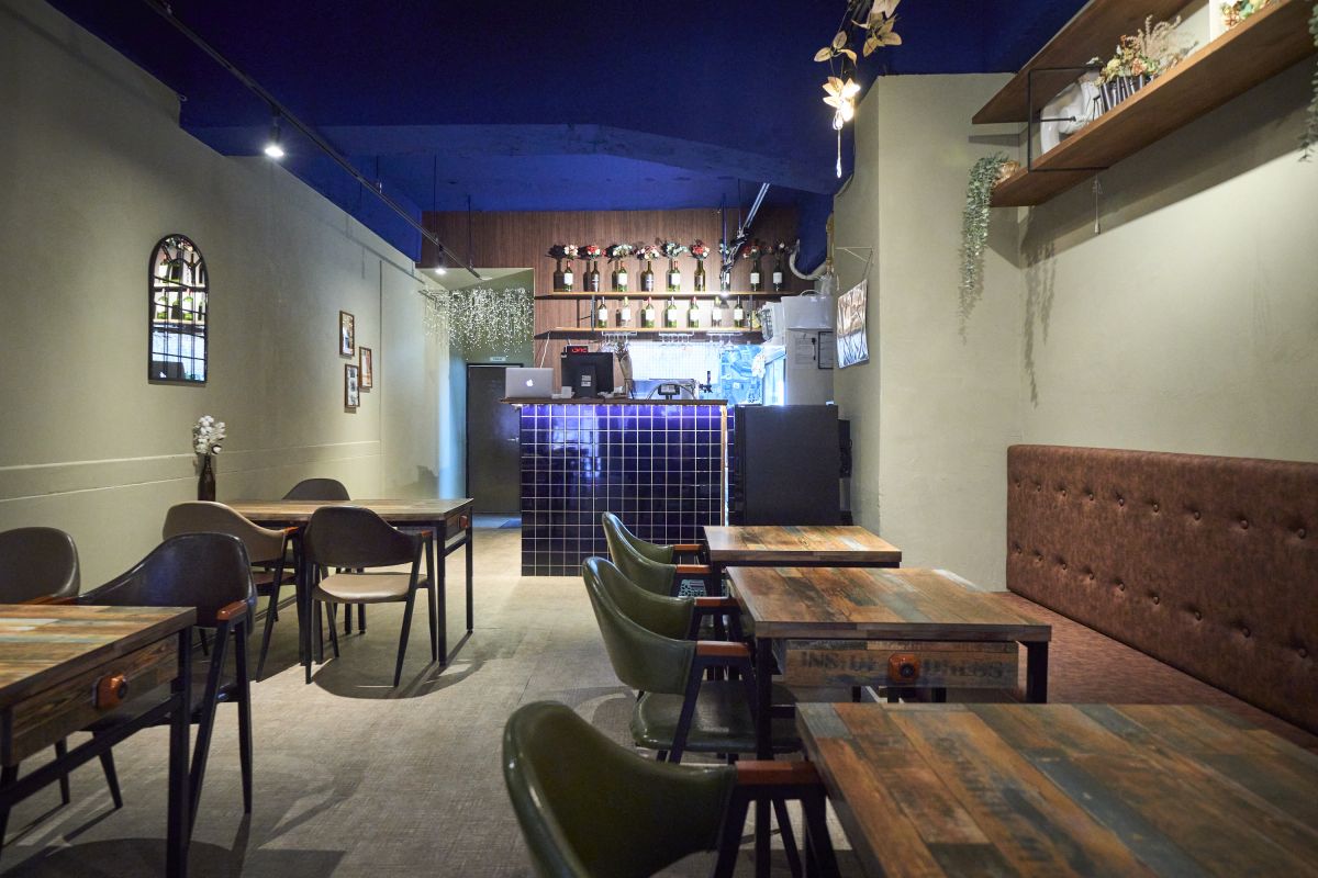 お店に入ると、ムードある空間が広がります。すっきりとしたインテリアに、居心地のよさを感じます。ほの暗い照明にウッド調のテーブル、青いタイルのカウンターがアクセントに。「韓国でいま流行っているインテリアなんですよ」とマネジャーの金さん。