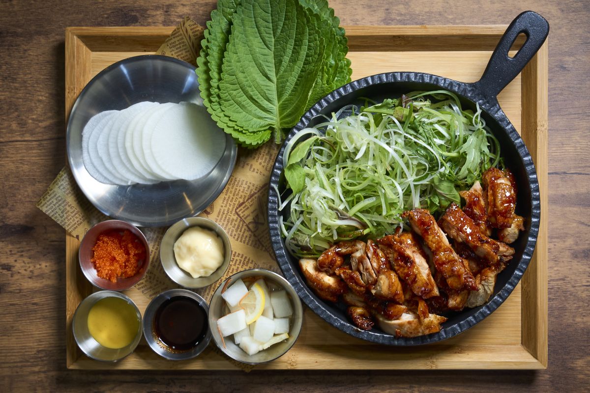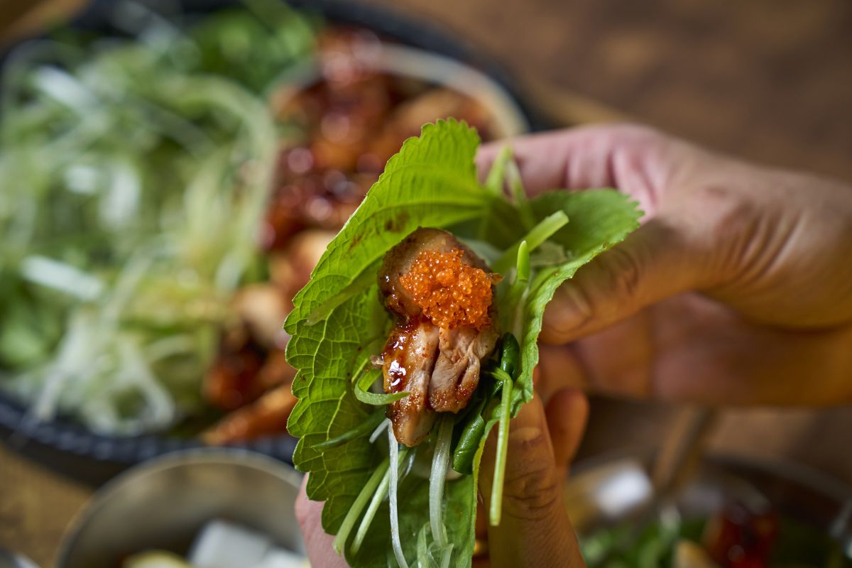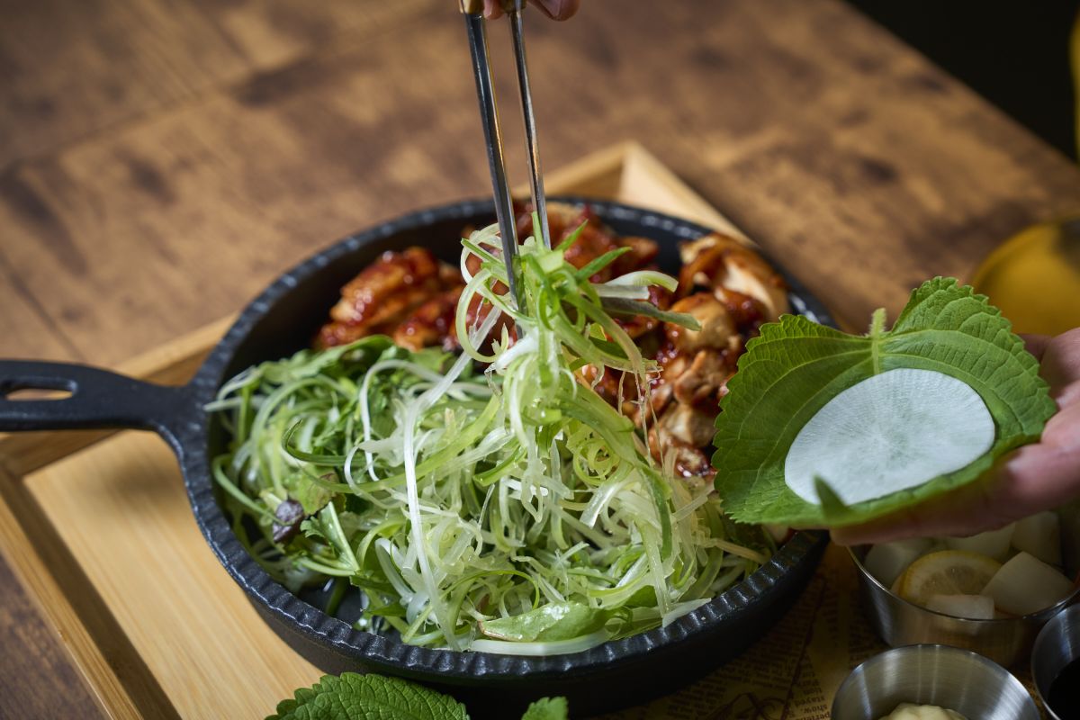 こちらは、甘辛バーベキューソースで味付けしたオーブンチキン。たっぷりとねぎをのせて、えごまの葉に挟んでいただきます。韓国ではチキンを食べるときには必ずといっていいほどついてくる、箸休めの大根の甘酢漬けも。ソースのおかわりは、無料です。
