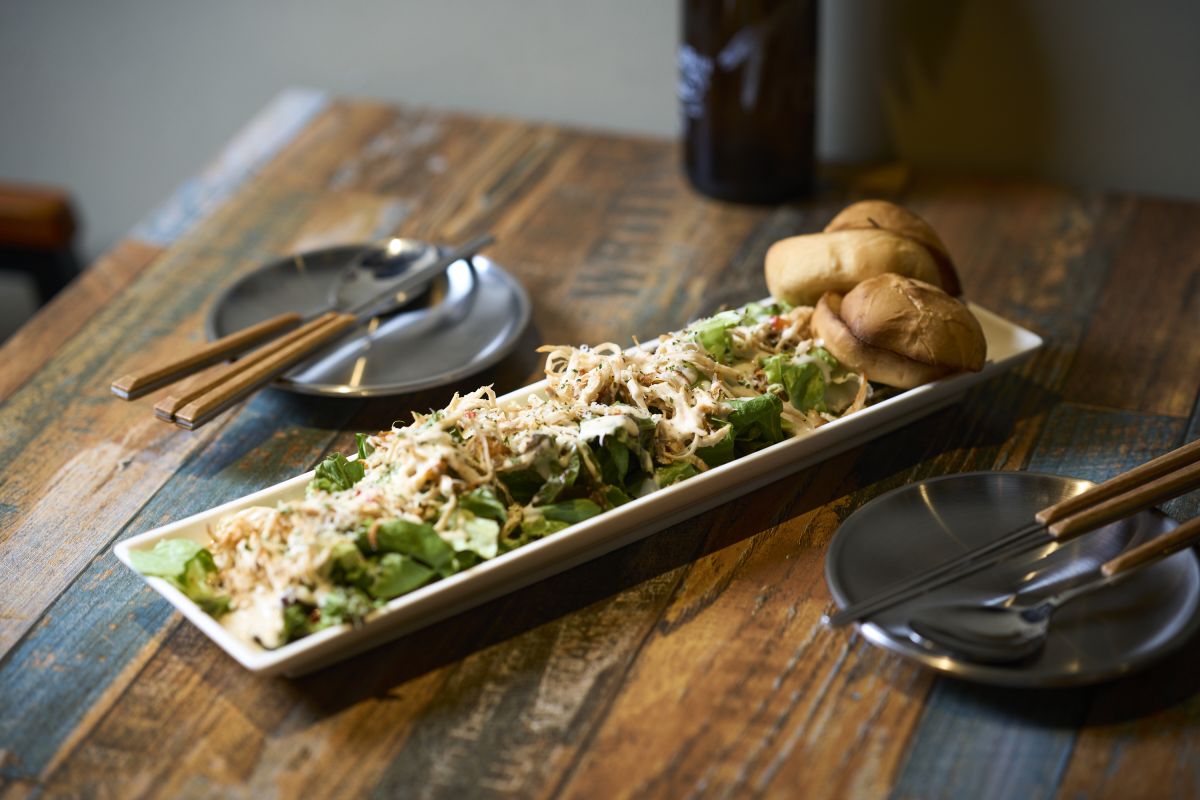 「DAOL」で女子会をするなら、必須で頼みたいのがこちらのサラダ。シーザーサラダに細くちぎった鶏むね肉がたっぷりとのっています。
