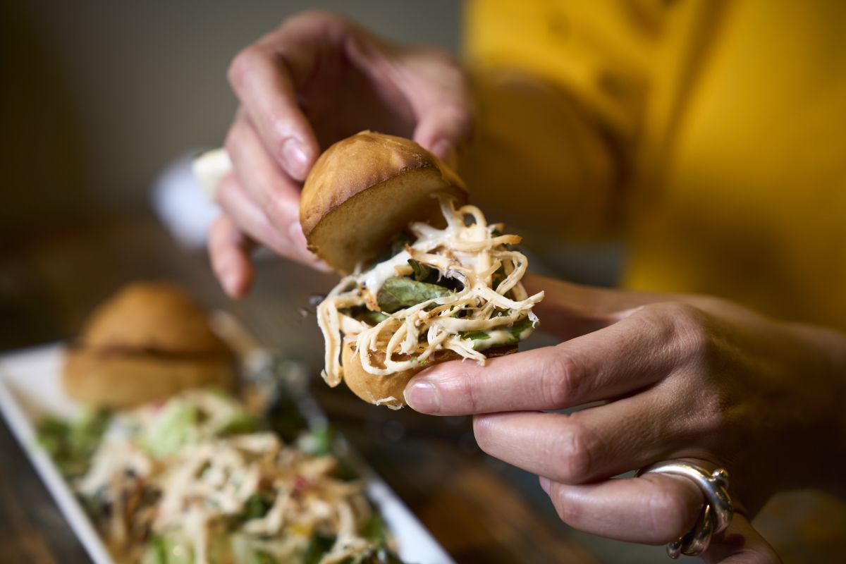 ねぎをたっぷり挟んで。チキンのおいしさはもちろん、野菜がいっぱいとれるのもヘルシーで、女子にはうれしい!