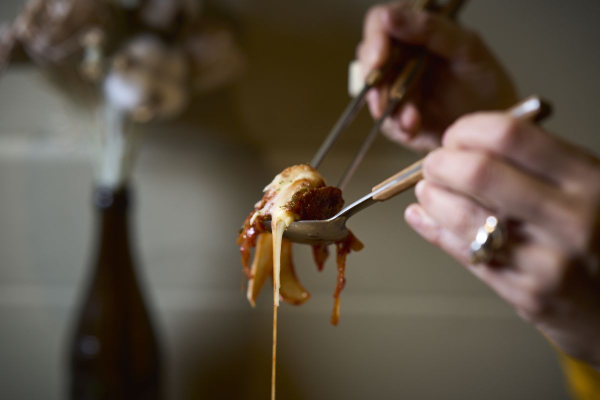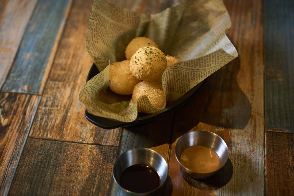 揚げたてのチーズボールもおいしい。中はチーズでぎっしりというより、ある程度の空洞があるためカリカリとした食感も楽しめます。ソースはカルビソースと、チーズチポレ。いずれのソースも、チーズボールに合わせるのは珍しいのだとか。