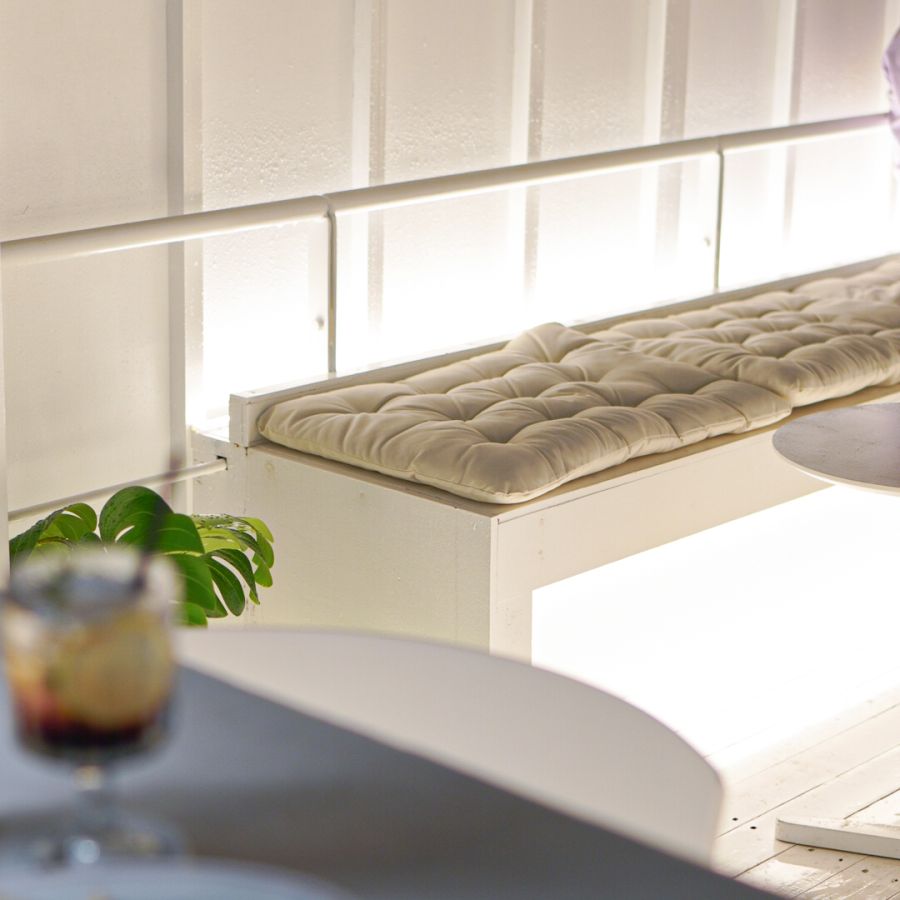 壁に沿って設置されたソファ席には2名用のサイドテーブルが4つ置かれていて、友人同士の2人組やカップルの利用にぴったり。