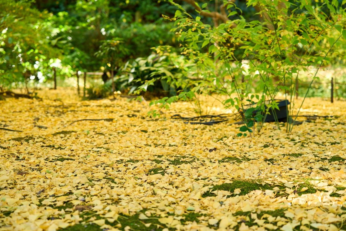 「旧天瑞寺寿塔覆堂」付近の大銀杏はイチョウの落葉が始まっており、地面いっぱいに広がる黄色の絨毯は人気のフォトスポット。12月ごろから紅葉が始まり、黄色から赤色に変わるグラデーションを楽しむこともできるんですよ。