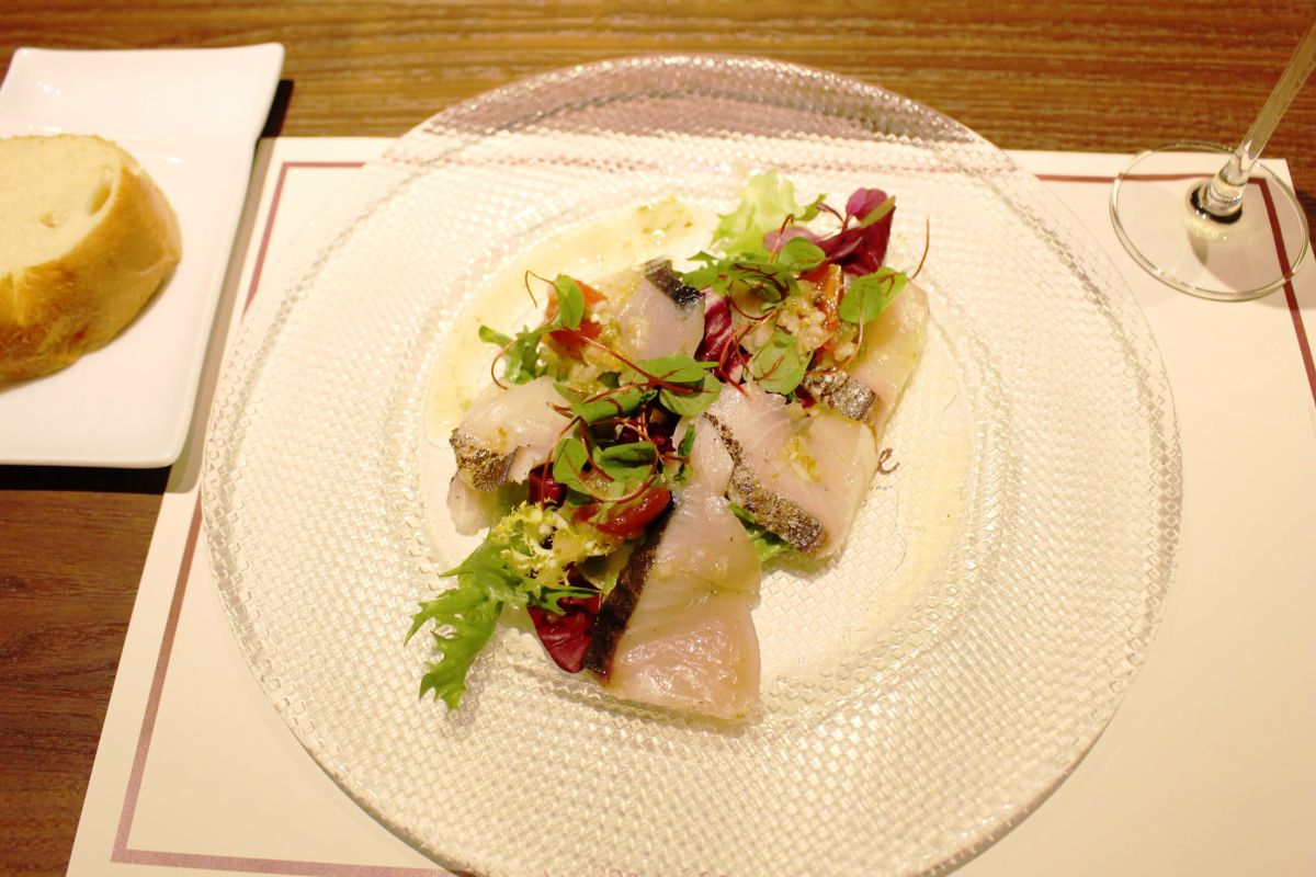 季節の前菜は「寒鰆のカルパッチョ」。脂ののった身がおいしく、さっぱりと仕上げられています。お魚は相模湾を中心に近郊の食材を使用しています。