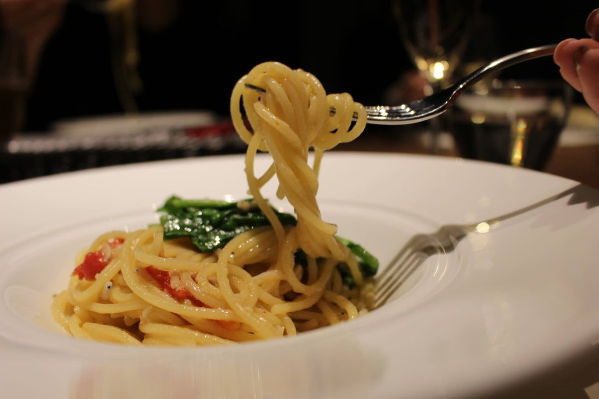 本日のパスタは「しらすとルッコラのペペロンチーノ」。麺はアルデンテに仕上げられていて、ピリ辛な味付けが食欲をそそります。