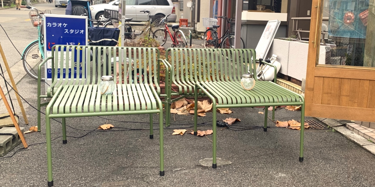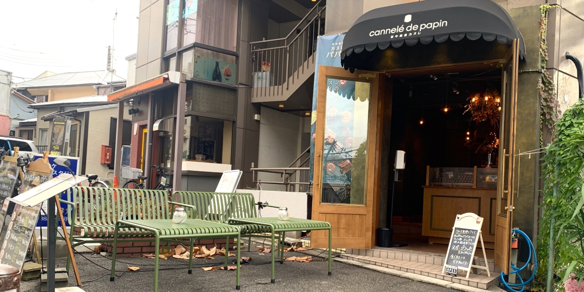 店頭には、素敵なカラーのテーブル席が!晴れた日にこちらでカヌレをいただくのも楽しそうですね。