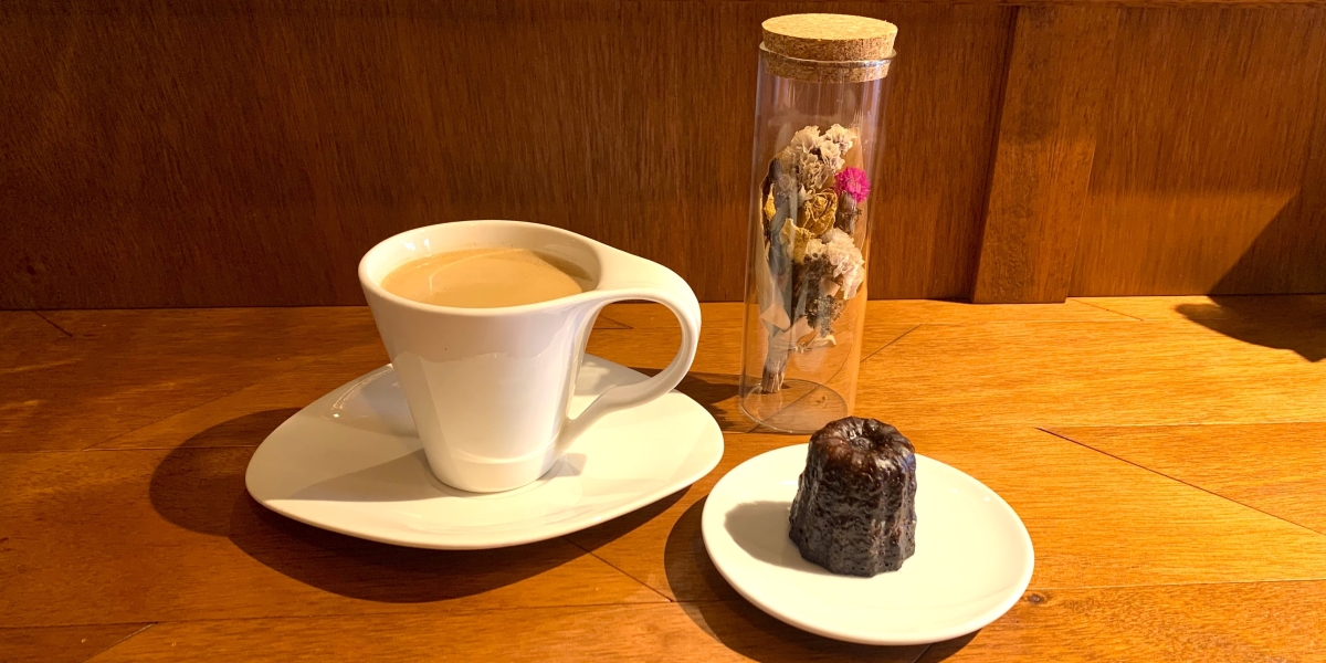 今回は、お店定番の「クラシック」と「ホットコーヒー」をいただきます。国産の牛乳、小麦粉、卵を使って作られた「クラシック」は、外がカリッと焼かれ、中はしっとりもっちり食感!香ばしい甘さのなかに、やさしくバニラが香ります。風味豊かなカヌレなので、コーヒーとの相性も抜群です!