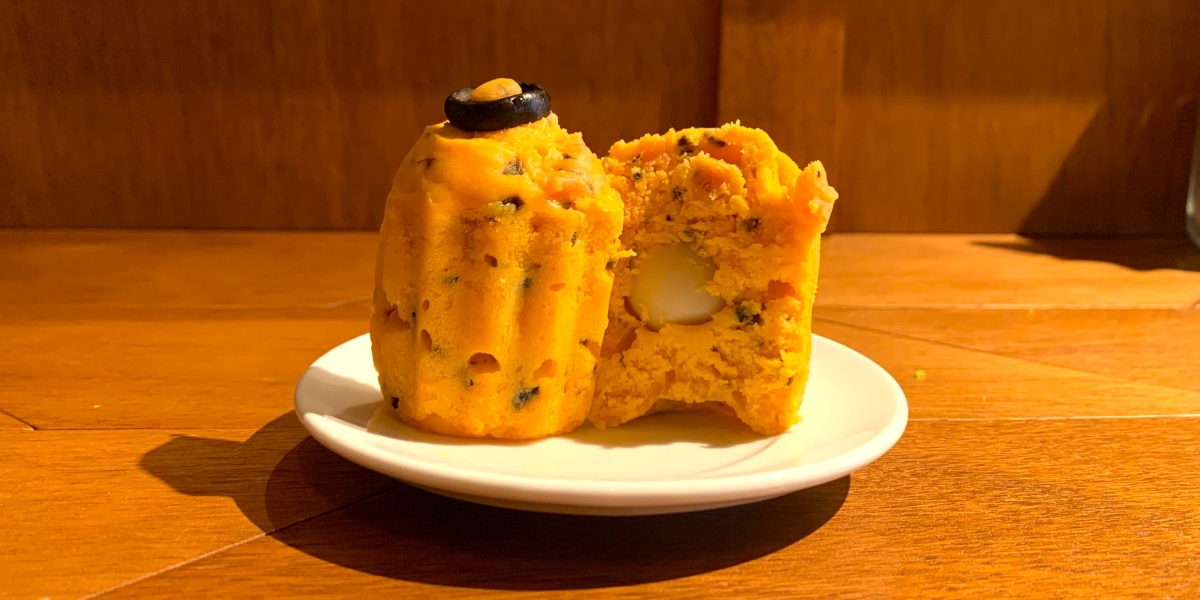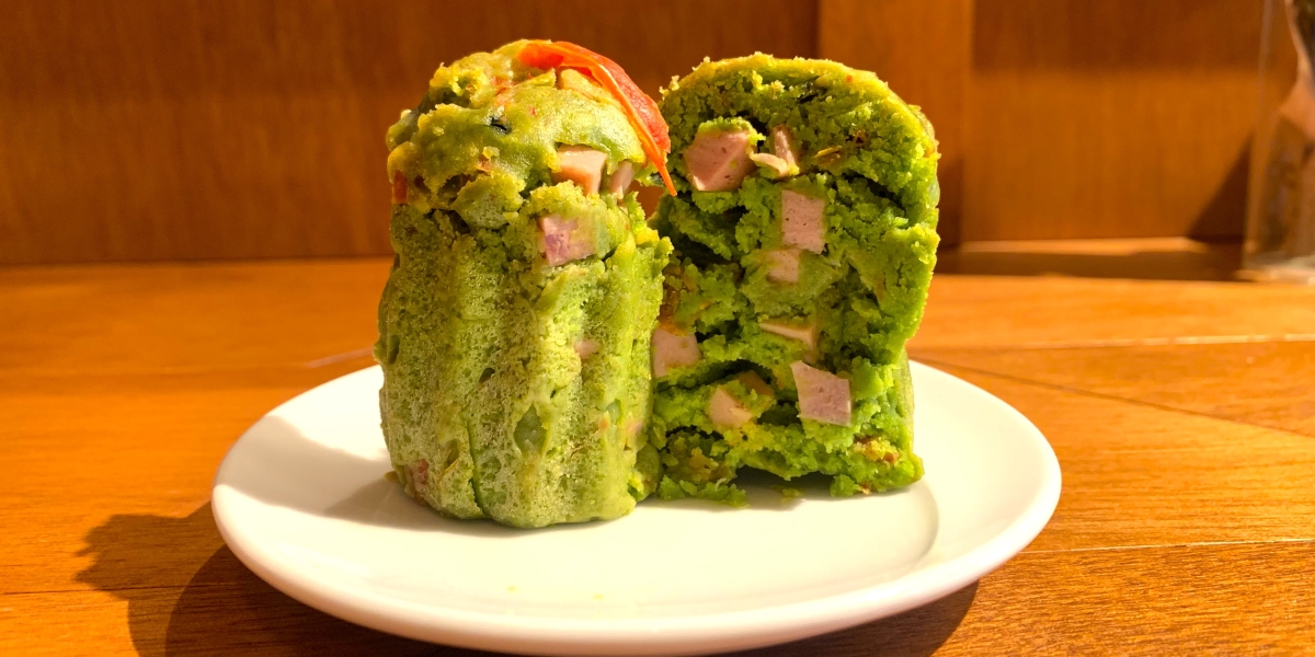 「エピナール」は、ホウレンソウ、ドライトマト、イタリア産ハムが入ったカヌレとのこと。鮮やかな緑色が印象的です。生地はスタンダードなカヌレとは異なり、しっとりとしていて蒸しパンのよう。サイズ感は「クラシック」よりも若干大きめで、ボリューミーなのもうれしいポイント。