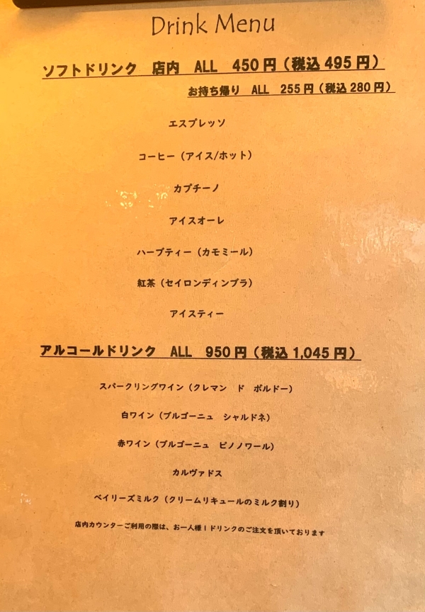 ドリンクメニューには、「赤ワイン」「白ワイン」「スパークリングワイン」などのアルコールメニューも豊富に取り揃えられているので、お店で1杯楽しんでみるのもおすすめです。その後、デザートとして「クラシック」や「塩カヌレ」をいただけば、大満足すること間違いなし!