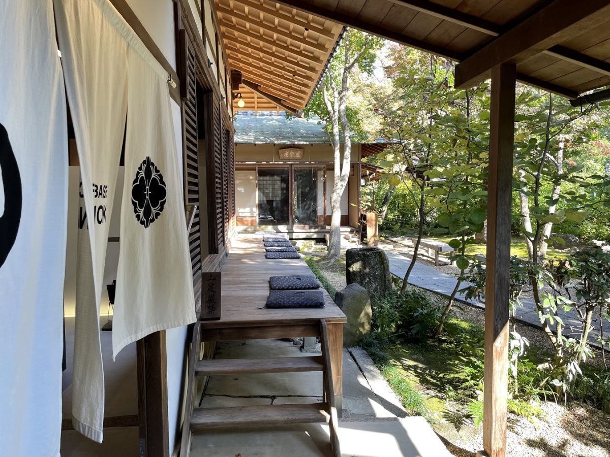 植え込みの奥にたたずむのは、京都御所から移築され茶室として使われていた歴史ある建物。境内の落ち着いた空気を感じながら、おしゃれなのれんに誘われて店内へ。