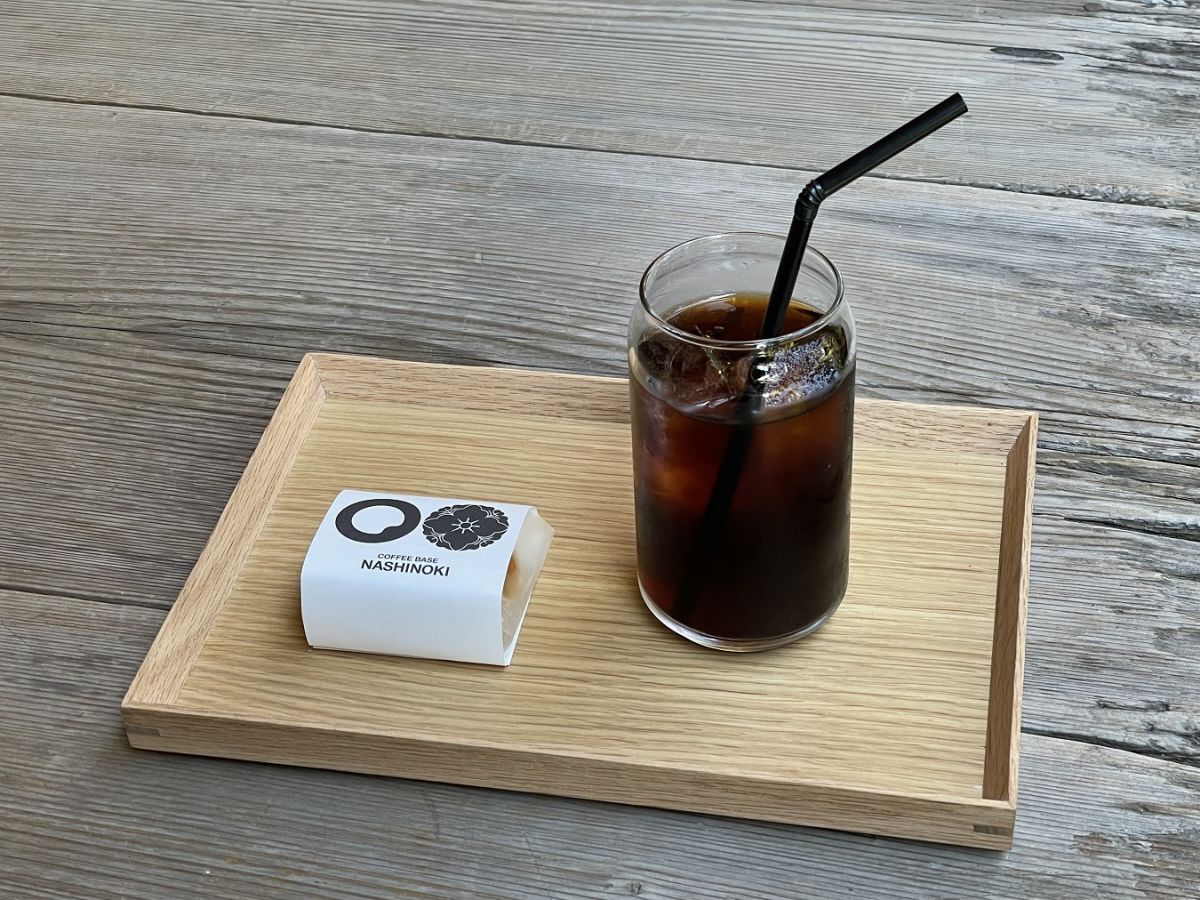 「Coffee Base NASHINOKI」のコーヒーは、自家焙煎の新鮮な豆にこだわるスペシャルティコーヒー。氷も含めて、すべて境内で湧く名水「染井の水」を使用しています。古くから茶の湯に適する水として知られる「染井の水」は、甘くまろやかな味。コーヒーの仕上がりも、まろやかです。写真は、「コールドブリュー(水出しアイスコーヒー)ブレンド+栗まんじゅうのセット」1000円。ごろっと大きな栗が入ったオリジナル栗まんじゅうは、コーヒーとよく合います。