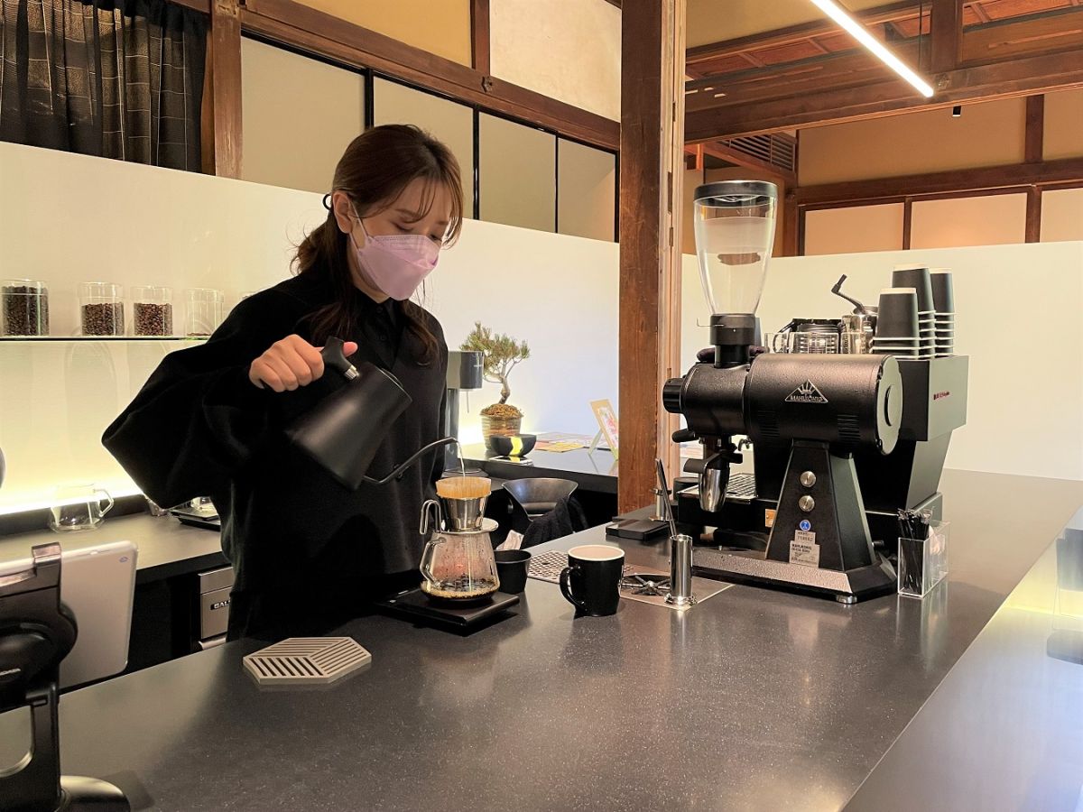 スペシャルティコーヒーの専門店「Coffee Base NASHINOKI」(こーひーべーす なしのき)があるのは、京都御苑の清和院御門からすぐ、梨木神社(なしのきじんじゃ)の境内です。宮中から移築され、茶室として使われていた旧春興殿をリノベーションし、参拝者の休憩処として2022年8月にオープン。コーヒーには、梨木神社の境内に湧く、京都三名水のひとつ「染井の水」を使っています。緑に囲まれた静かな境内にたたずむ、歴史ある建造物でいただくコーヒーは格別です!