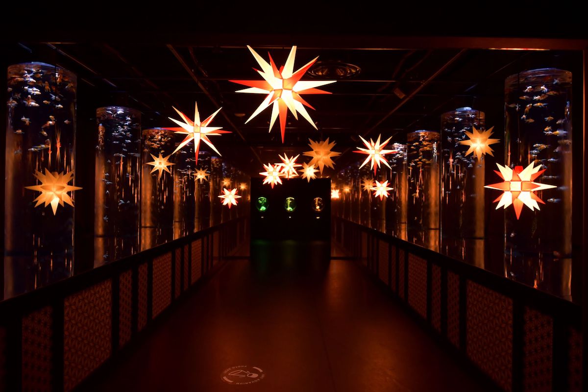 日本の寺社建築に見られる回廊を表現した空間に立ち並ぶ金魚の列柱「金魚の回廊」。ずっと続いているかのように見えるこの空間には、ヘルンフートというクリスマス飾りのシンボルともいえる明かりが灯ります。左右に並ぶ色とりどりに光る水槽と、やさしい光を放つ赤と白の星。「金魚の回廊」最初の水槽作品はクリスマスカラーとなり登場します。