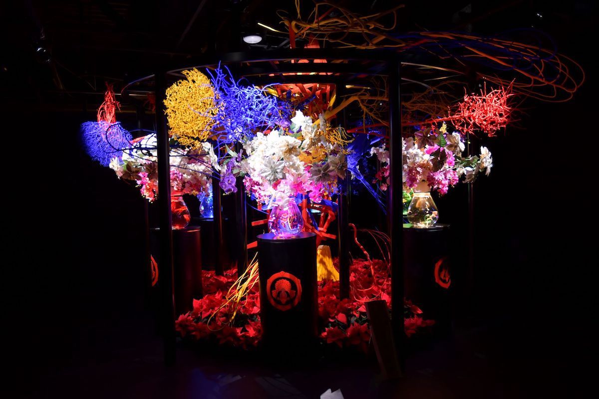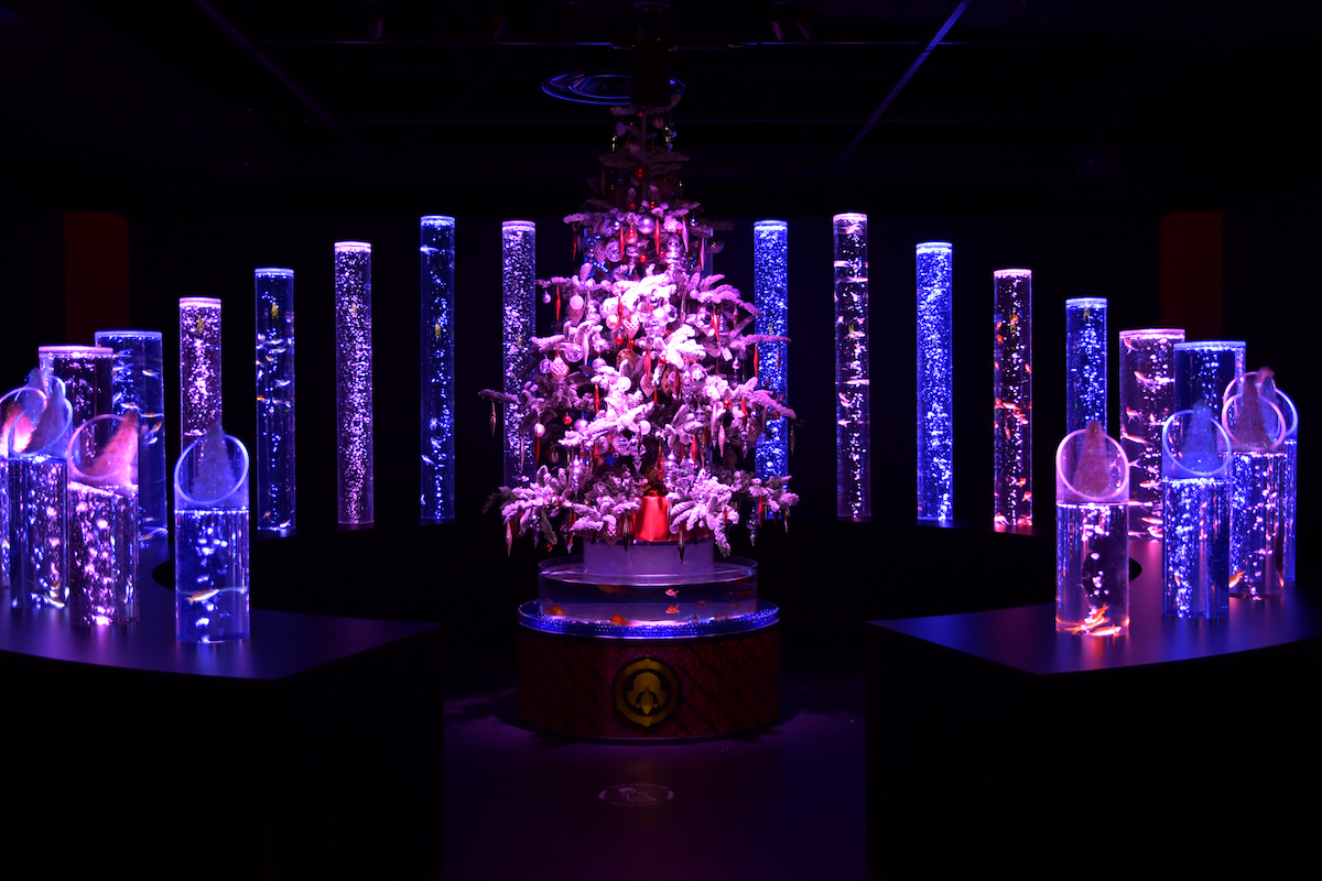 「フラワーリウム」は華道家・假屋崎省吾氏とのコラボレーション作品です。クリスマスまでの期間、本作を“クリスマスフラワー”ともよばれるポインセチアが彩ります。ポインセチアの美しい赤色と、花瓶を見立てた水槽作品、その中を泳ぐ金魚の融合が生み出すクリスマスの景色が魅力です。