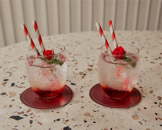 ウェルカムドリンクは、ローズやライチ、ラズベリーをソーダとミックスして仕上げたHer lip toらしい華やかなノンアルコール微炭酸カクテル「クリスマスローズ」。