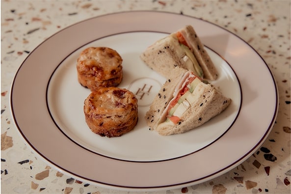 ・セイボリー:ロースハムとブリーチーズのサンドイッチ/ ビーツと牛頬肉の煮込みのキッシュ サワークリーム添え/ モッツァレラチーズムースとフルーツトマトのタルト バジルのソルベ