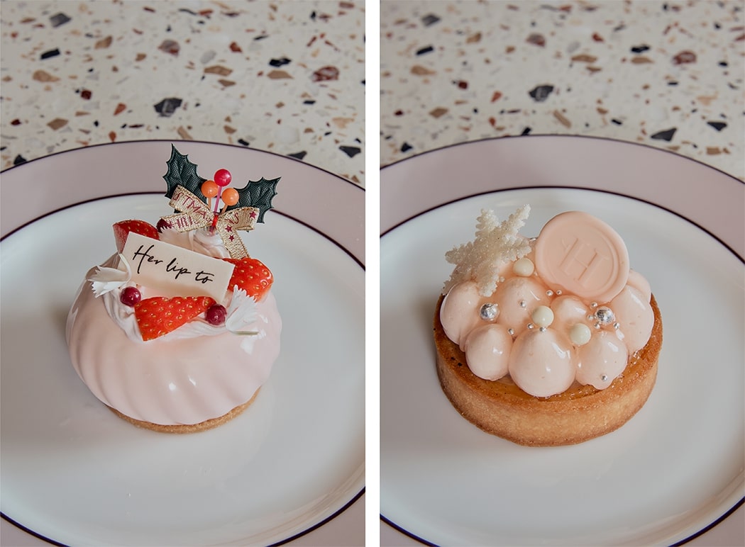 「スノーフレークアプリコットローズタルト」は、タルトの生地の上にアプリコットコンフィチュールとローズマスカルポーネクリームをトッピング。「ホーリーチーズベリームース」は、フロマージュムースの中にフレーズ デ ボアジュレとムースを包み込んでいます。