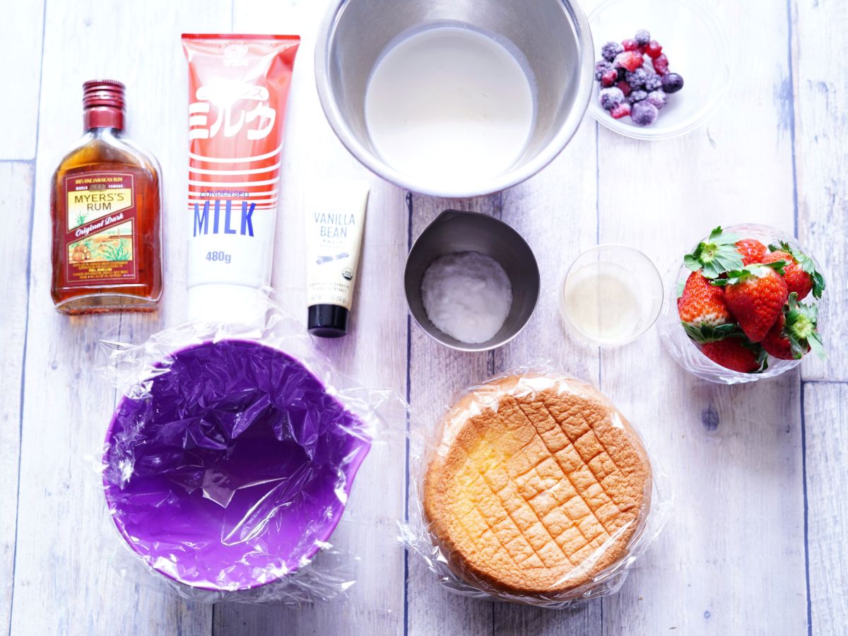 | (シロップ) グラニュー糖…20g 水…60cc ラム酒…20cc (ケーキ) 粉ゼラチン…3g 水…大さじ1 5号スポンジ(市販)…1台 生クリーム(脂肪分43%以上)…300ml グラニュー糖…20g コンデンスミルク…40g ラム酒…小さじ1 (あれば)バニラビーンズペースト…小さじ1/2 いちご…1パック (デコレーション) いちご…1パック 冷凍ミックスベリー…適量 ミント…適量 アラザン…適量 粉糖…適量 |