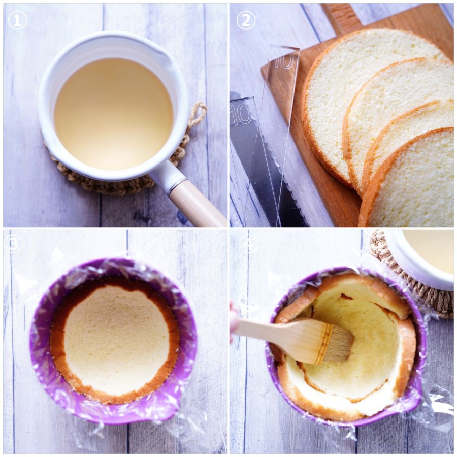 ⑥ハケでシロップを打ったスポンジでふたをします。上からもシロップを打ち、ラップで包んで、冷蔵庫で2時間ほど休ませます。