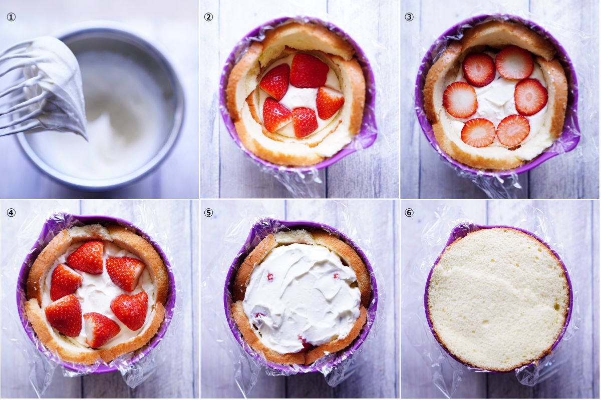 ③さらに生クリームを入れ、1cm厚さにスライスしたいちごを並べます。