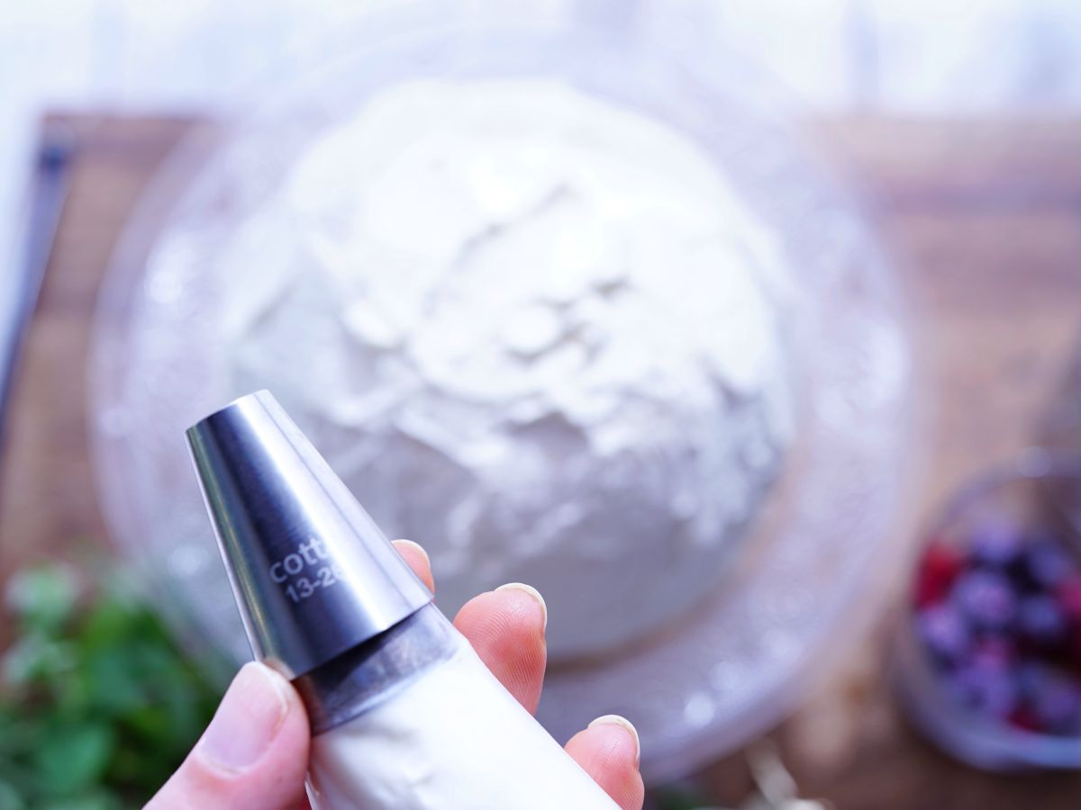 お玉1杯分くらいの生クリームをトッピング用に取り分け、口金をつけた絞り出し袋に入れておきます。