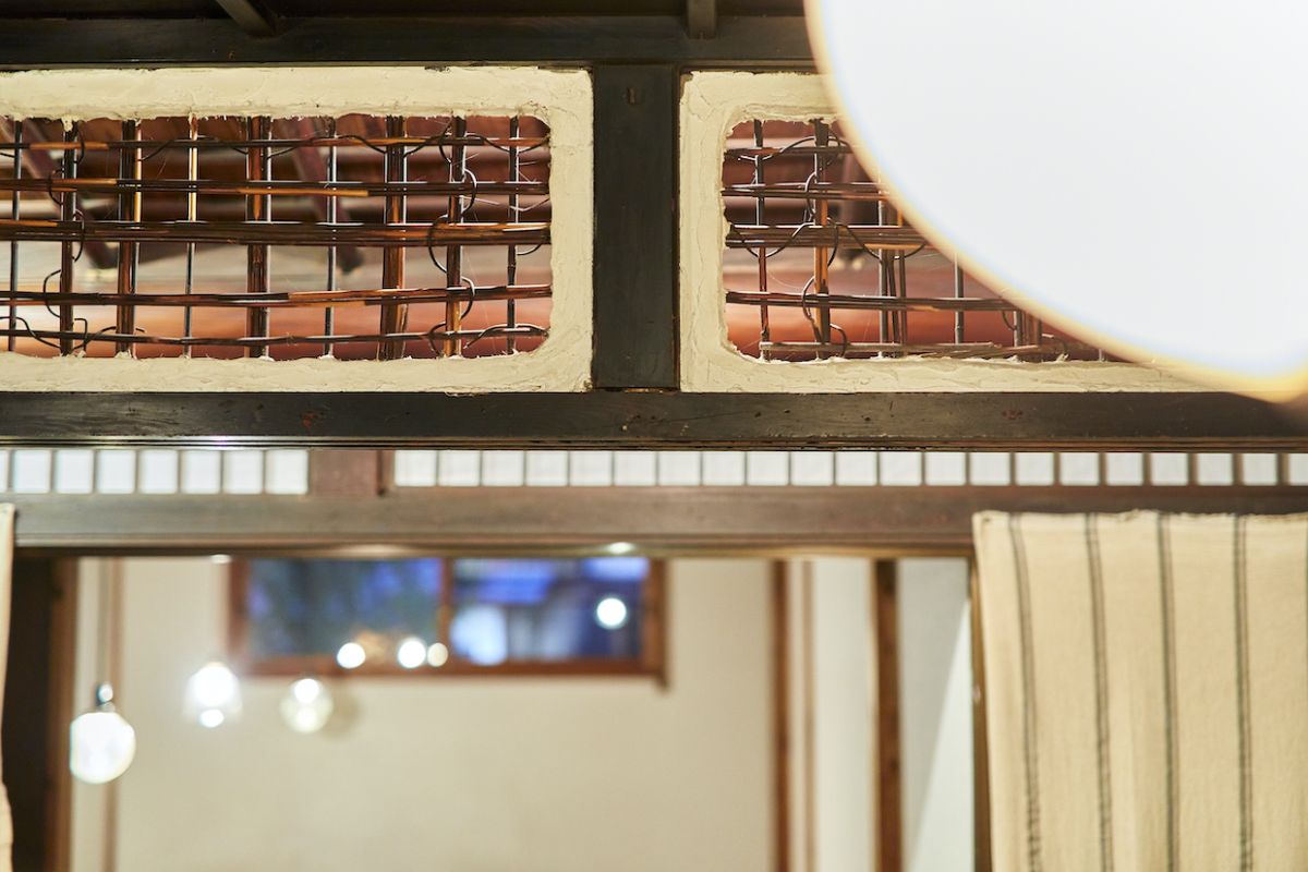 明治期までの町家に特徴的な厨子二階(つしにかい)の開口部には格子が嵌め込まれており、かつてハシリニワがあった部分には、吹き抜けの火袋があり、おくどさんの名残もあります。白壁に塗り込められた柱も町家ならではの風情があります。