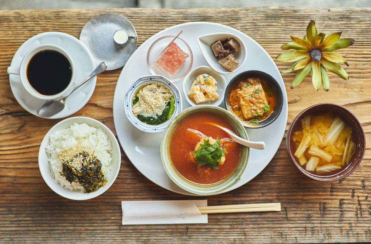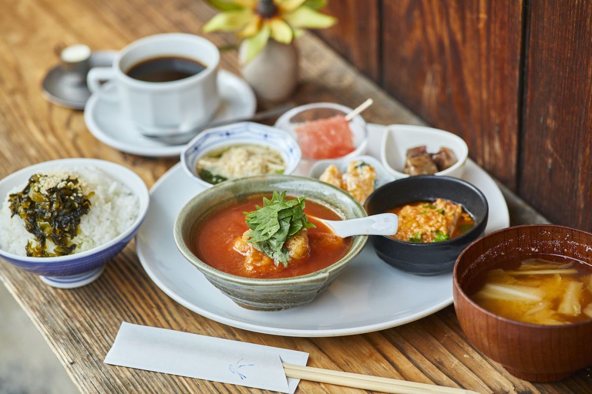 奈良町家の雰囲気はもちろんリピーターを惹きつけるのが昼も夜も同じ値段で提供される「カナカナごはん」。この日の内容は、タラの唐揚げ和風トマトソース、えのきと小松菜のおひたし、豚とトマトの坦々湯豆腐、柿の白和え、こんにゃくの含め煮、高菜のせご飯、味噌汁、ルビーグレープフルーツの寒天。酸味、甘み、ピリ辛さ、さまざまな味覚をバランスよく味わえる構成です。