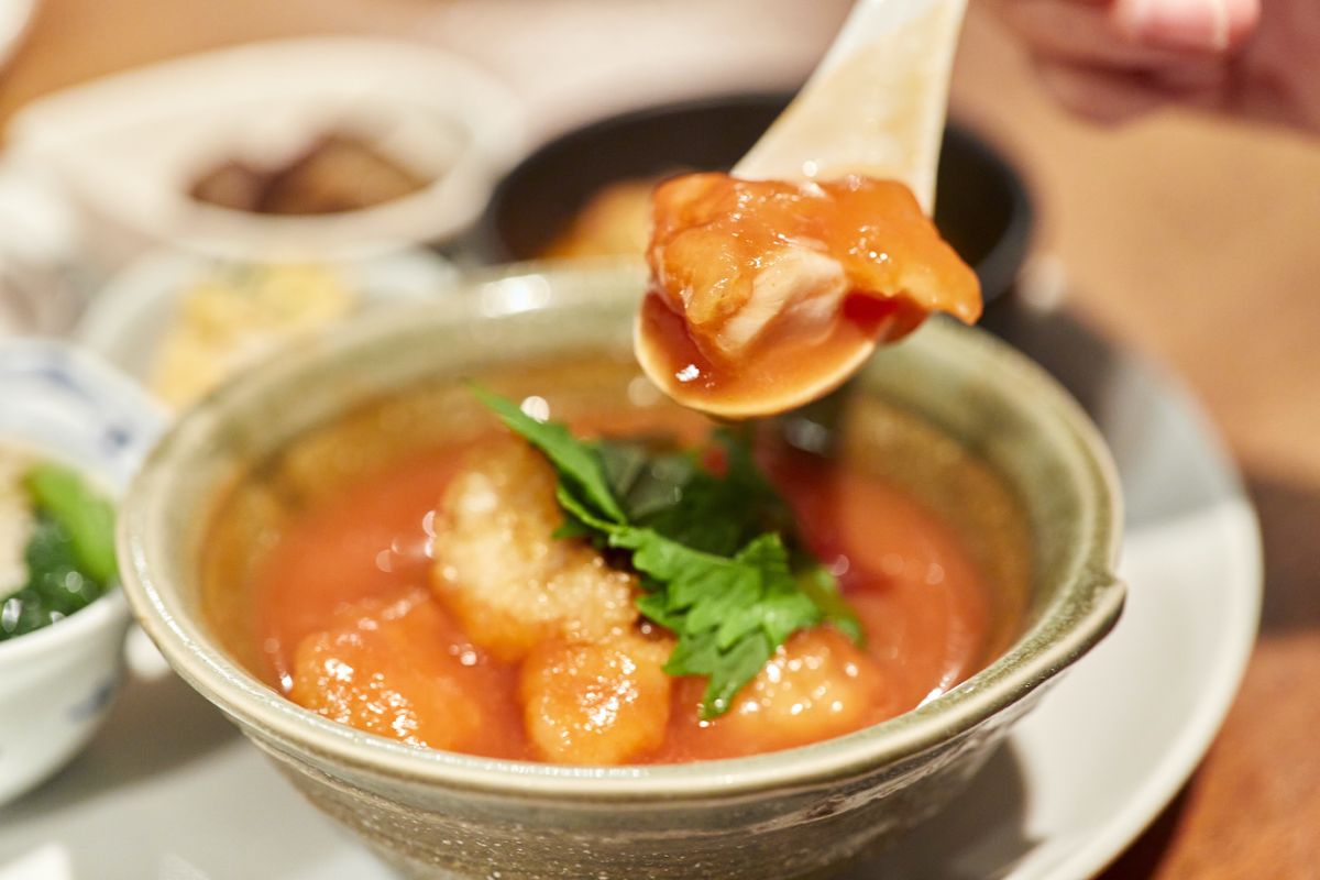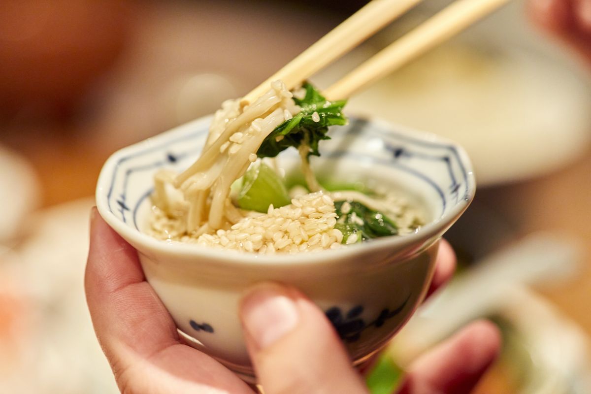 例えばこの日の一品の中だと「えのきと小松菜のおひたし」。もちろん冷たくてもおいしいのですが、日に日に寒くなってくるこの季節、一品の小鉢が温かいのはとてもうれしいことです。ほのかに香る柚子の風味も上品で、すべての料理が手抜きなく丁寧に作られていることがよくわかります。