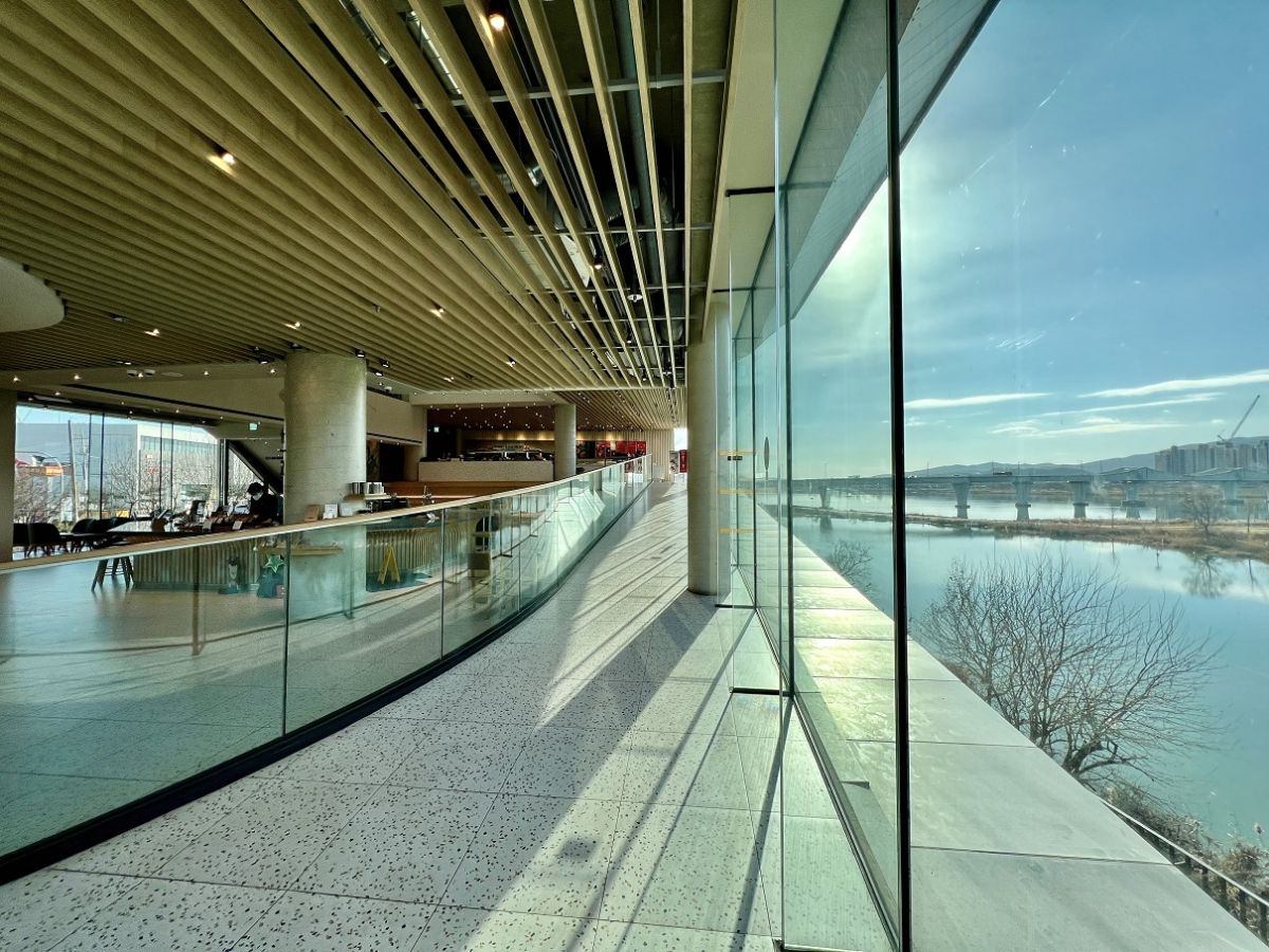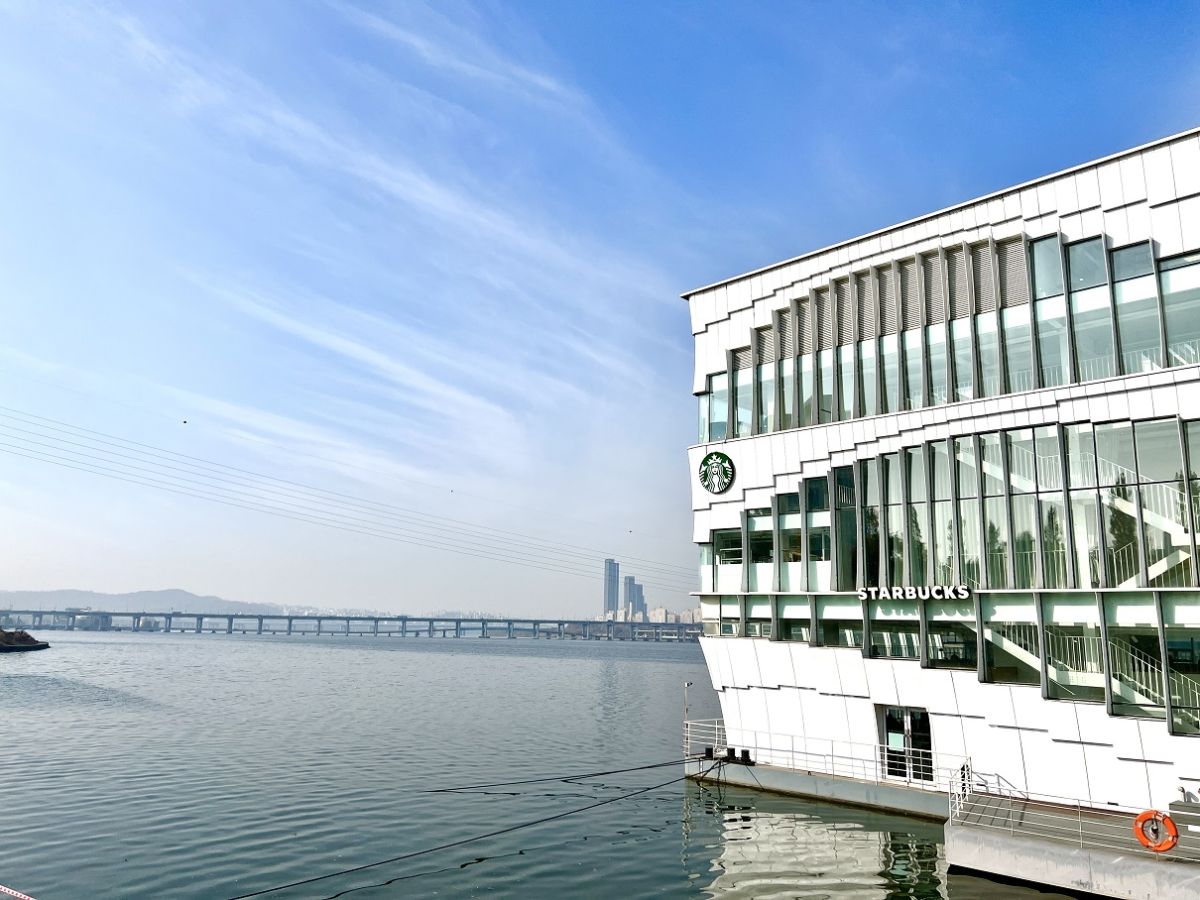 ソウルの象徴・漢江(ハンガン)に浮かぶ「ソウルウェイブアートセンター店」は、“今、最もソウルで訪れたいスタバ”といわれる人気店。オープンは2020年で、ソウルウェイブアートセンターという展示会などが開かれる複合施設のなかにあります。