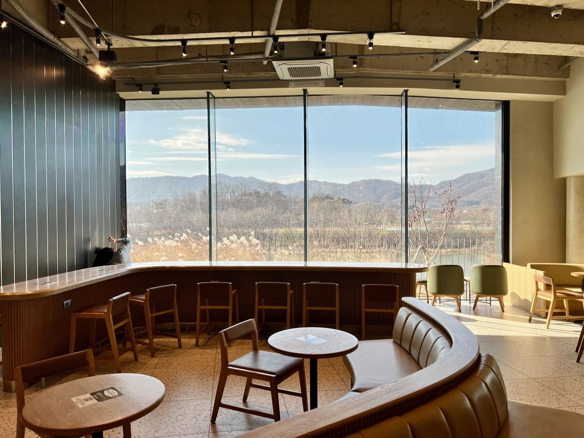 ド・ヤンピョンDTR店のもう一つの魅力ポイントは、壁一面がガラス張りで、大自然の雄大な景色を眺めながらカフェ時間を過ごせること。