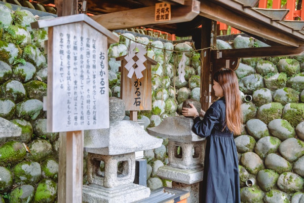 奉拝所の右手奥には一対の石灯籠があり、頭部分の「おもかる石」は、願いを占えると参拝者から人気のスポット。願い事を心に念じて持ち上げて軽く感じるなら願いが叶い、反対に重く感じるとその願いが叶う日が遠いといわれています。心を静めて一心に願いをイメージしながら、石を持ち上げてみましょう。