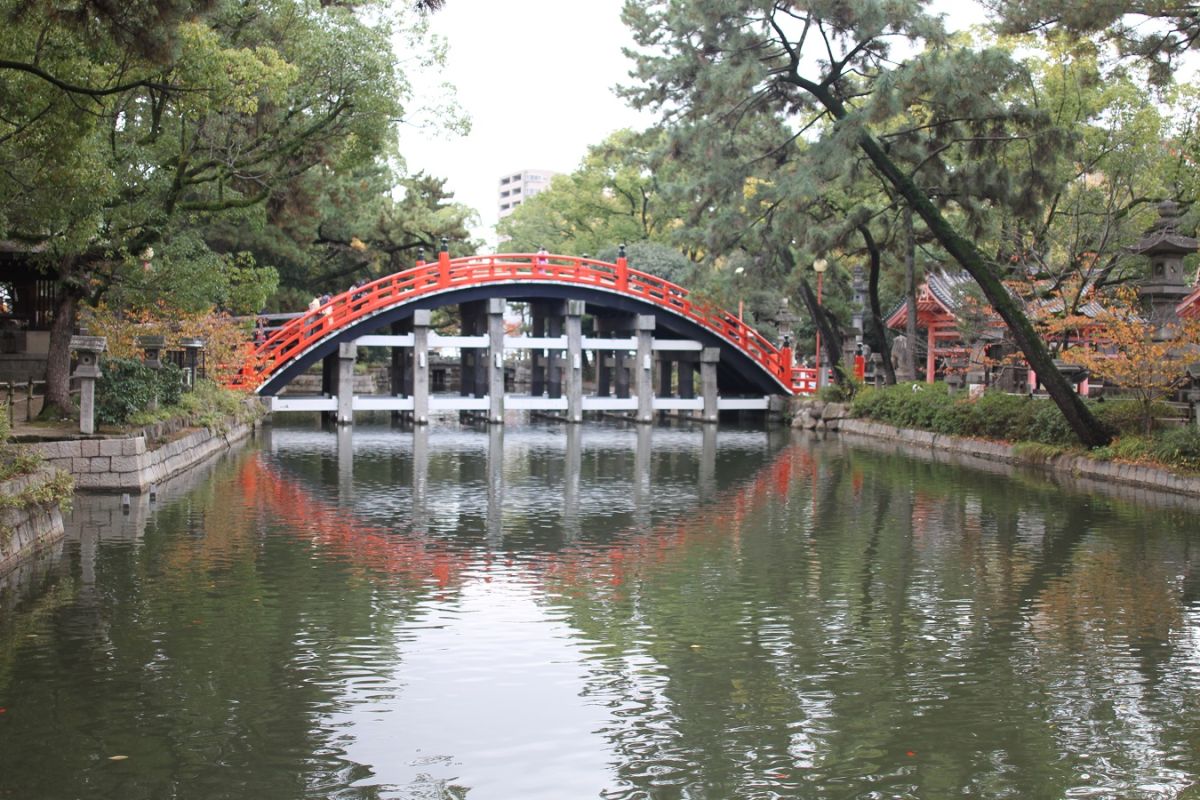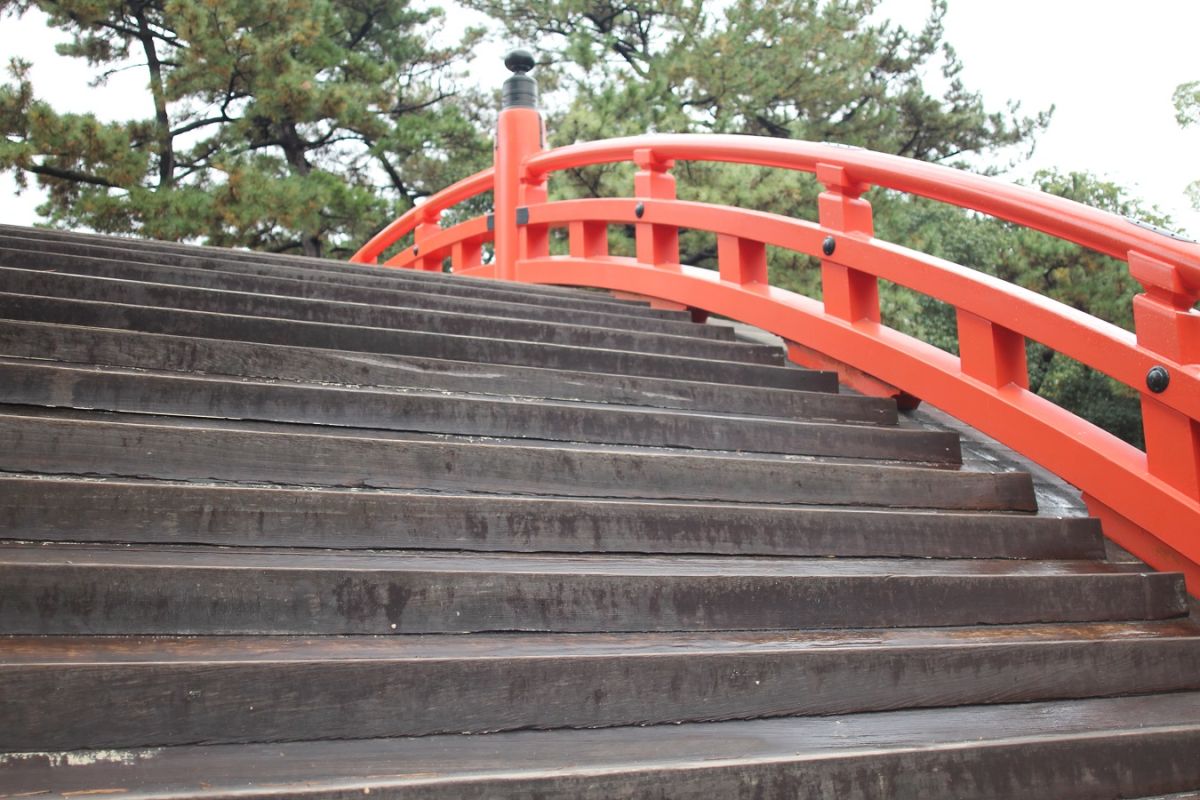 住吉大社の見どころといえば、この「反橋(そりはし)」。長さは約20m、高さ約3.6m、幅約5.5mの橋で、最大傾斜は約48度あります。「この橋を渡るだけでお祓いになる」との信仰もあるそうなので、参拝時にはぜひ橋を渡って本殿へ。